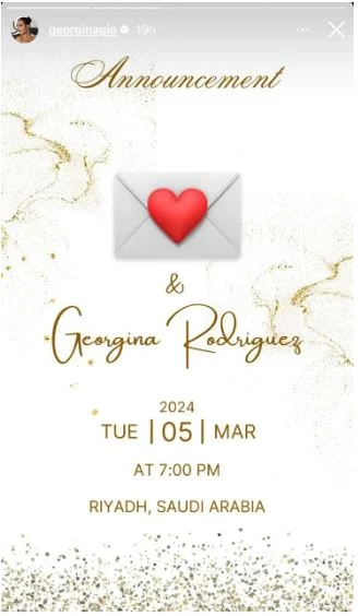 وأثارت جورجينا ضجة واسعة بسبب منشور لها عبر "إنستجرام"، نشرت فيه صورة تشبه دعوة الزفاف مكتوب عليها جورجينا رودريجز وقلب، مع موعد يشير إلى اليوم الثلاثاء، في الرياض، في المملكة العربية السعودية.