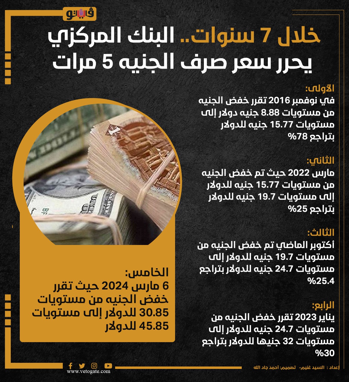 خلال 7 سنوات.. البنك المركزي يحرر سعر صرف الجنيه 5 مرات (إنفوجراف)