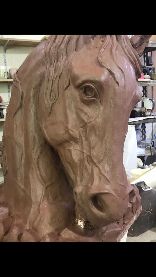أيضا، من أعمالها نحت رأس حصان، والخامة النهائية بوليستر، بمقاس 50× 60، وارتفاعه 70 سم.