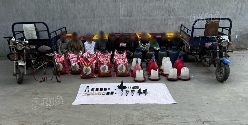 في مديرية أمن الدقهلية؛ ضبط 10 عمال "لأحدهم معلومات جنائية"؛ لقيامهم بتكوين تشكيل عصابي تخصص نشاطه الإجرامي في سرقة مزارع الدواجن بأسلوب "تسلق السور وقص الأقفال".. وبحوزتهم (بندقية آلية - طبنجة - 2 فرد محلي - عدد من الطلقات - 2 مركبة تروسيكل "بدون لوحات معدنية" - مقص كبير الحجم).