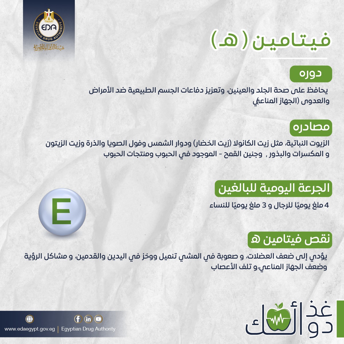 وكشفت هيئة الدواء المصرية عن اهمية تناول فيتامين هـ في الجسم حيث يحافظ على صحة الجلد والعينين، وتعزيز دفاعات الجسم الطبيعية ضد الأمراض والعدوى (الجهاز المناعي).