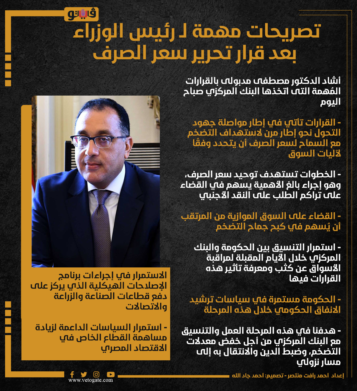تصريحات مهمة لـ رئيس الوزراء بعد قرار تحرير سعر الصرف (إنفوجراف) الأربعاء 06/مارس/2024 - 02:59 م 3/6/2024 2:59:51 PM أحمد رأفت منتصر شارك طباعة 18 حجم الخط شارك طباعة تحرير سعر الصرف توحيد سعر الصرف قرارات البنك المركزي اليوم سعر الدولار اليوم مجلس الوزراء اليوم