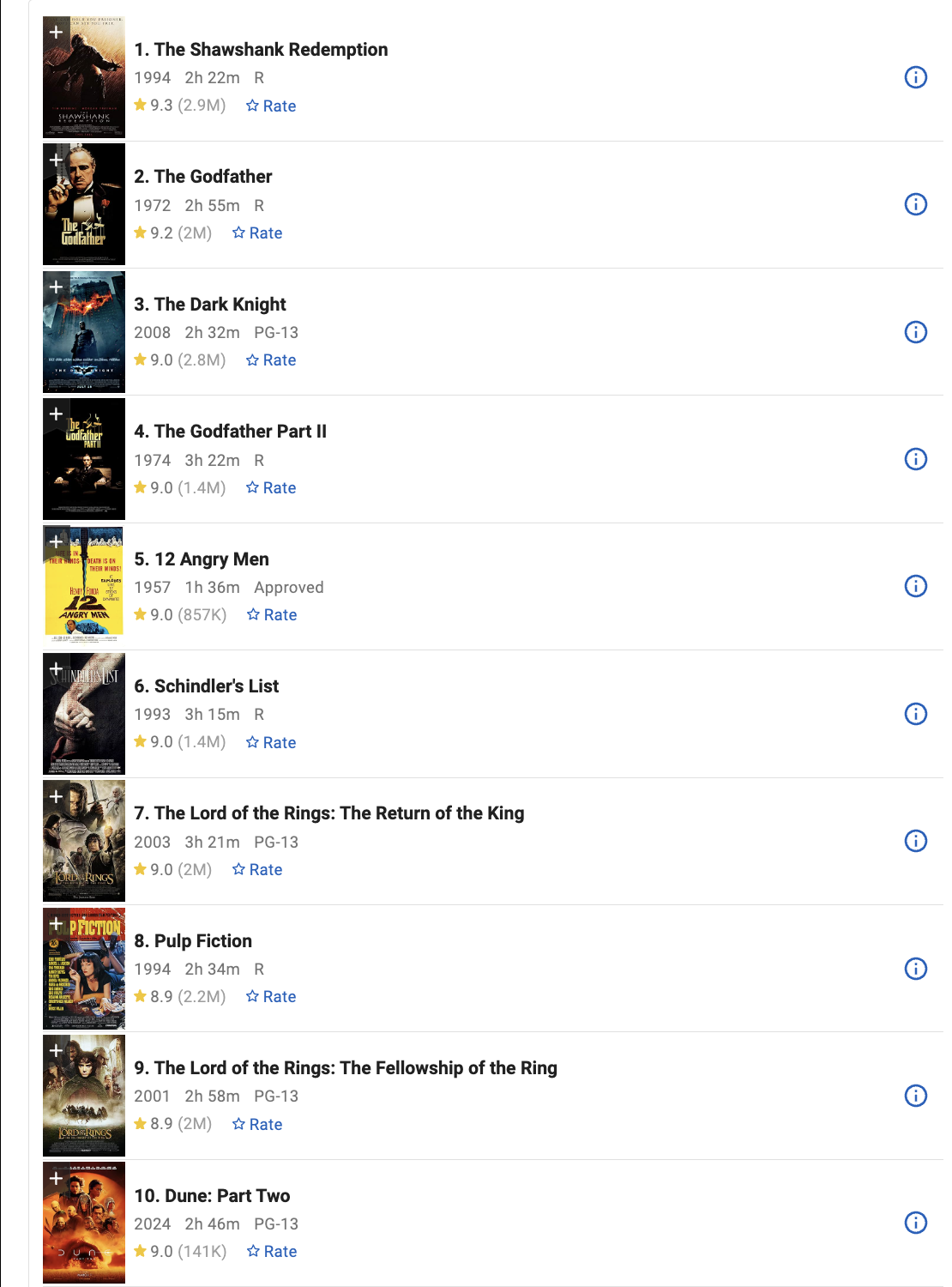 واحتل فيلم Dune: Part Two، المركز العاشر في قائمة IMDb، لأفضل 10 أفلام، وذلك بعد حصوله علي تقييمات نقدية وجماهرية مرتفعة، بعد أيام من طرحه للمشاهدة في صالات السينما.