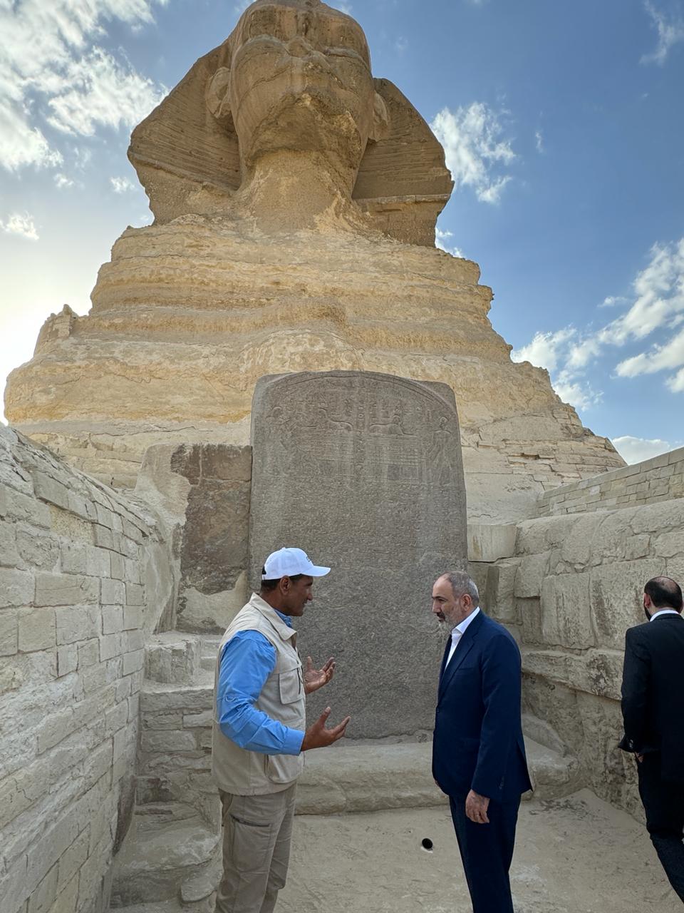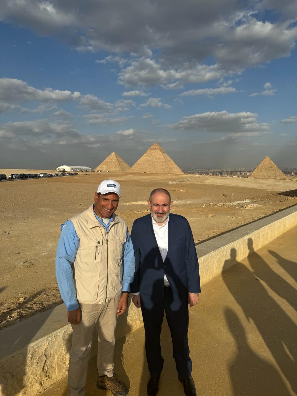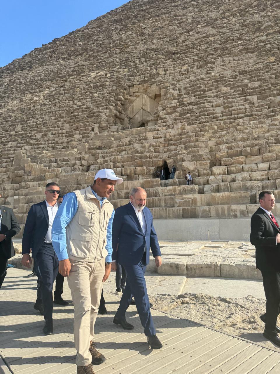 وكان في استقباله أشرف محيي الدين مدير عام منطقة آثار الهرم، والذي رافقه في جولة بالمنطقة الأثرية استهلها بزيارة الهرم الأكبر، حيث أبدي رئيس الوزراء الأرميني إعجابه الشديد بالهرم، واستمع إلى شرح مفصل عن طريقة بناء الهرم وعدد الأحجار به ومصدرها، كما تضمنت الجولة زيارة منطقة البانوراما وتمثال أبو الهول حيث تعرف على طريقة نحت التمثال ولوحة الحلم.