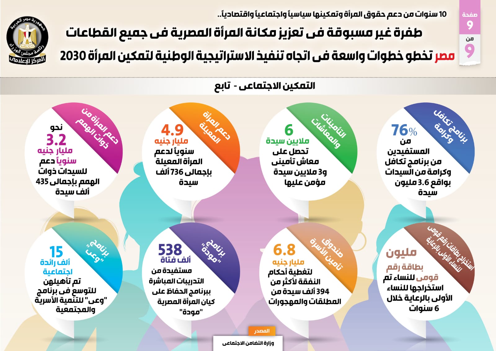 وألمح التقرير إلى بلوغ نسبة السيدات من إجمالي المستفيدين من برنامج تكافل وكرامة 76% بواقع 3.6 مليون سيدة، فيما تحصل 6 ملايين سيدة على معاش تأميني و3 ملايين سيدة مؤمن عليها، بجانب تقديم 4.9 مليار جنيه سنويًا لدعم المرأة المعيلة بإجمالي 736 ألف سيدة، بالإضافة إلى تخصيص نحو 3.2 مليار جنيه سنويًا لدعم السيدات ذوات الهمم بإجمالي 435 ألف سيدة، علاوة على استخراج مليون بطاقة رقم قومي للنساء الأولى بالرعاية خلال 6 سنوات.