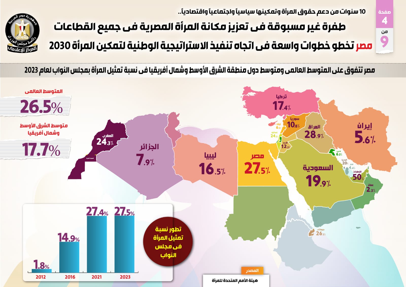 وأبرز التقرير تفوق مصر على المتوسط العالمي ومتوسط دول منطقة الشرق الأوسط وشمال أفريقيا في نسبة تمثيل المرأة بمجلس النواب لعام 2023 لتصل إلى 27.5%، مقابل 27.4% عام 2021، و14.9% عام 2016، و1.8% عام 2012، علمًا بأن المتوسط العالمي يبلغ 26.5%، ومتوسط الشرق الأوسط وشمال أفريقيا 17.7%.