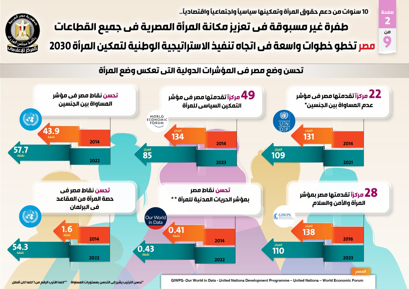 وعلى صعيد متصل، تقدمت مصر 28 مركزًا بمؤشر المرأة والأمن والسلام GIWPS))، حيث شغلت المركز 110 عام 2023، مقابل المركز 138 عام 2016، كما تحسنت نقاط مصر في حصة المرأة من المقاعد في البرلمان لتصل إلى 54.3 نقطة عام 2022، مقابل 1.6 نقطة عام 2014.