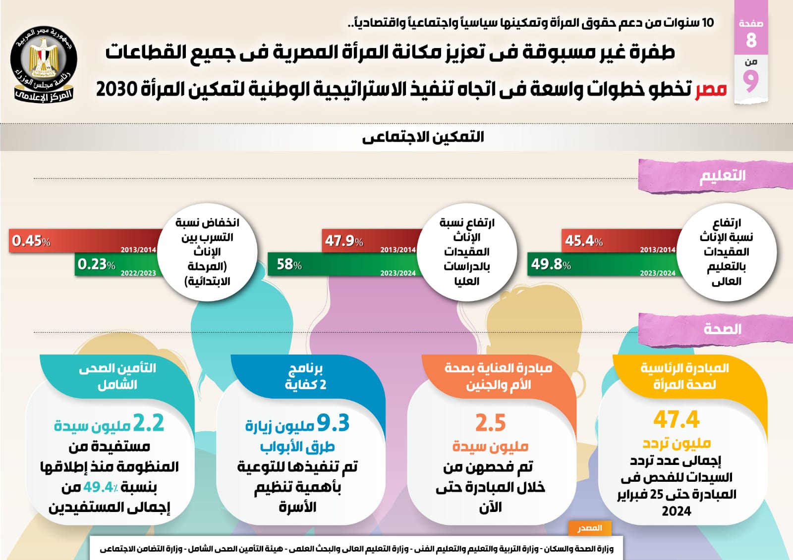 وفيما يخص الصحة أشار التقرير إلى المبادرة الرئاسية لصحة المرأة حيث بلغ إجمالي عدد تردد السيدات للفحص 47.4 مليون تردد من خلال المبادرة حتى 25 فبراير 2024، كما تم فحص 2.5 مليون سيدة حتى الآن من خلال مبادرة العناية بصحة الأم والجنين، علاوة على تنفيذ 9.3 مليون زيارة طرق الأبواب من خلال برنامج 2 كفاية للتوعية بأهمية تنظيم الأسرة، بجانب استفادة 2.2 مليون سيدة من منظومة التأمين الصحي الشامل منذ إطلاقها بنسبة 49.4% من إجمالي المستفيدين.