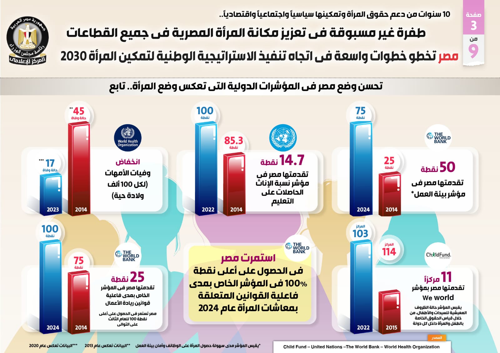 وجاء في التقرير أن مصر تقدمت 50 نقطة في مؤشر بيئة العمل (The World Bank) حيث سجلت 75 نقطة عام 2024، مقابل 25 نقطة عام 2014، علمًا بأن المؤشر يقيس مدى سهولة حصول المرأة على الوظائف وأمان بيئة العمل، بجانب تقدم مصر 14.7 نقطة في مؤشر نسبة الإناث الحاصلات على التعليم لتسجل 100 نقطة عام 2022 مقابل 85.3 نقطة عام 2014، علاوة على انخفاض وفيات الأمهات لكل 100 ألف ولادة حية World Health Organization))، حيث وصلت إلى 17 حالة وفاة عام 2023 (البيانات تعكس عام 2020)، مقابل 45 حالة وفاة عام 2014 (البيانات تعكس عام 2013).