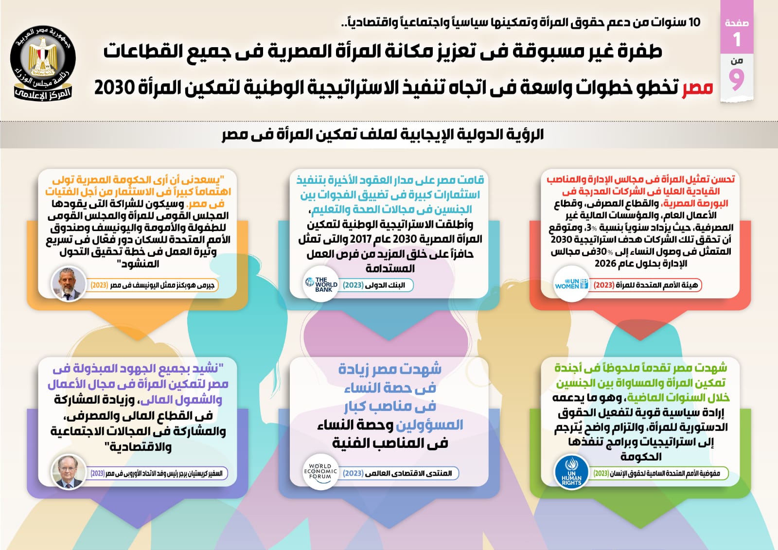 وفي هذا الصدد نشر المركز الإعلامي لمجلس الوزراء تقريرًا تضمن إنفوجرافات تسلط الضوء على الطفرة غير المسبوقة في تعزيز مكانة المرأة المصرية في جميع القطاعات، وخطوات مصر الواسعة في اتجاه تنفيذ الاستراتيجية الوطنية لتمكين المرأة 2030، وذلك بعد 10 سنوات من دعم حقوق المرأة وتمكينها سياسيًا واجتماعيًا واقتصاديًا.