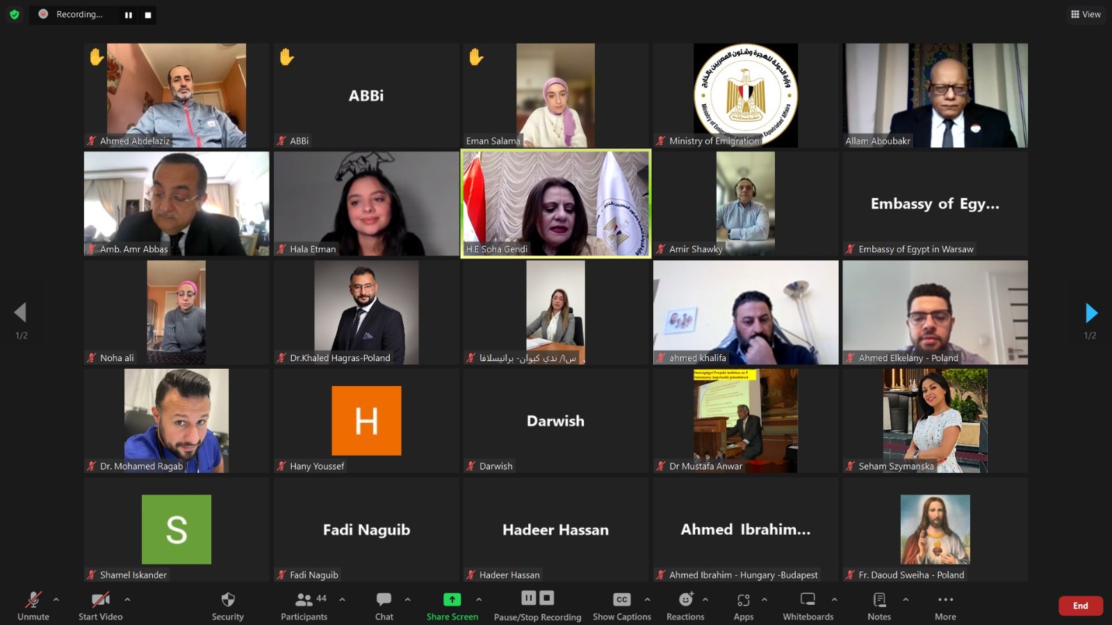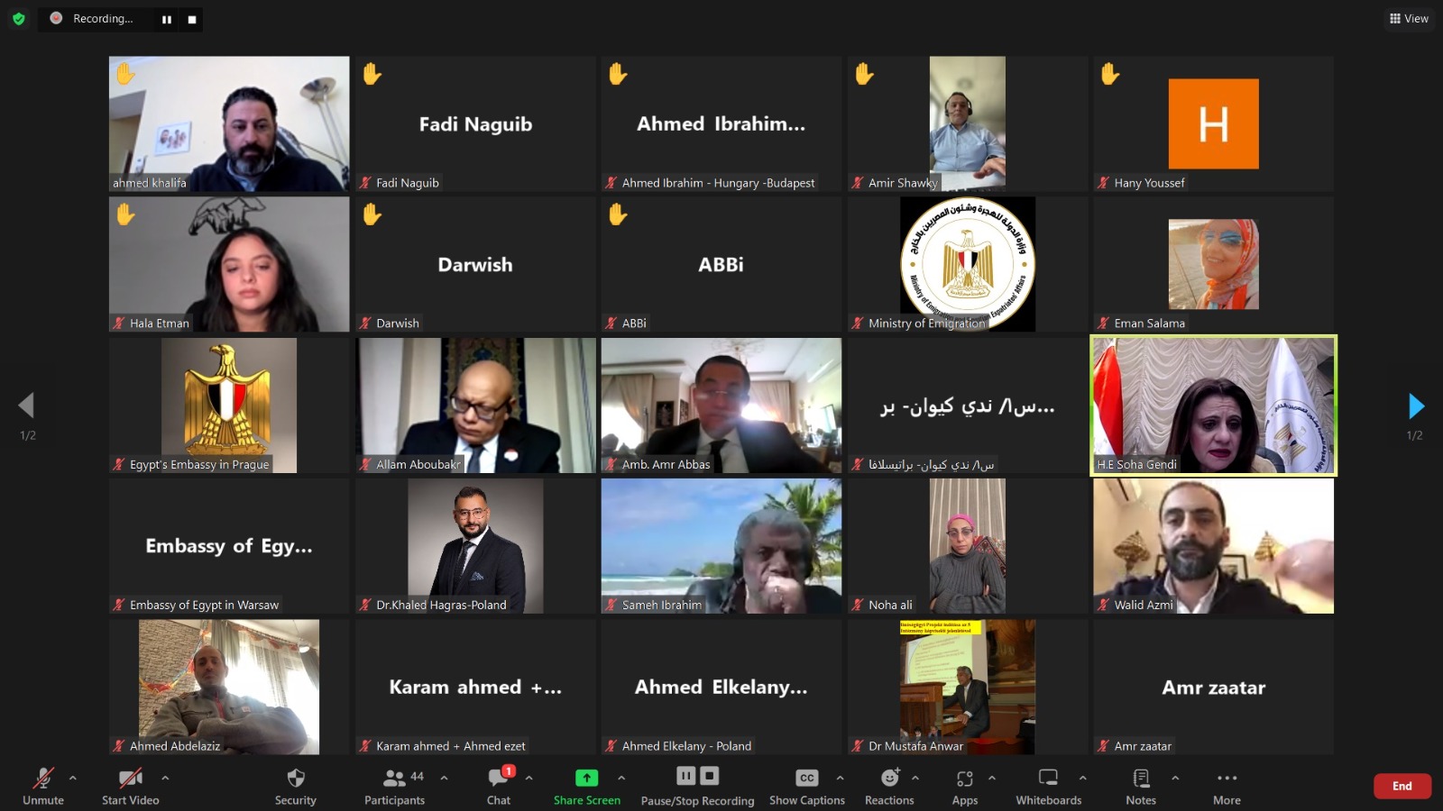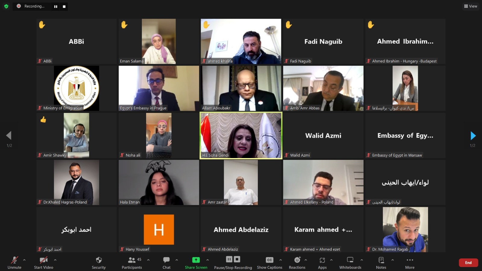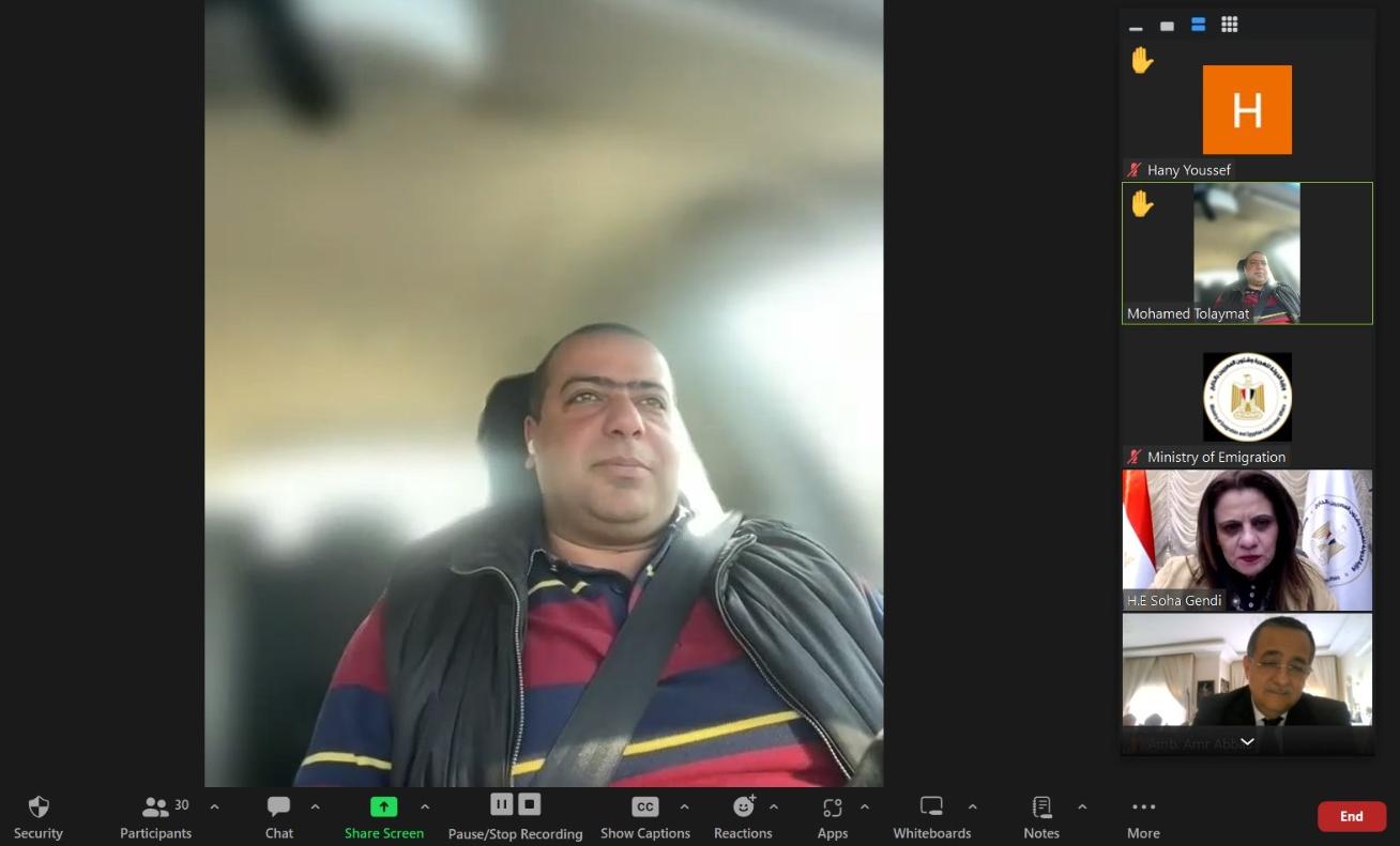 وفي بداية الاجتماع، رحبت وزيرة الهجرة، بجميع أعضاء ورموز الجاليات المصرية في المجر وبولندا والتشيك وسلوفاكيا، موضحة أن استراتيجية الوزارة تستهدف التواصل مع كافة شرائح المصريين بالخارج، وفي إطارها يتم التواصل المباشر مع الجاليات المصرية بالخارج، والتي تسعى من خلالها لحل أي مشكلات أو تحديات تواجه المصريين بالخارج؛ مبينة أن مبادرة «ساعة مع الوزيرة» تعد واحدة من ركائز هذه الاستراتيجية، حيث تم تنفيذ ما بات يقرب من ١٠٠ لقاء مع الجاليات افتراضيًا في إطار المبادرة، هذا خلاف اللقاءات القطاعية للأطباء والطلبة ودول النزاعات والمستثمرين وغيرهم الكثير، بهدف التواصل المستمر والفاعل والوصول لأكبر عدد من الجاليات بكل دول العالم. وخدمة أكبر قدر من المصريين وتذليل ايه تحديات يتعرضون لها.