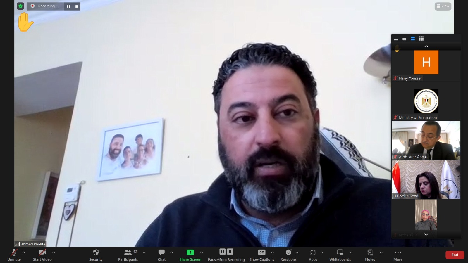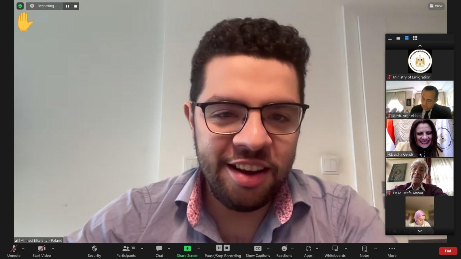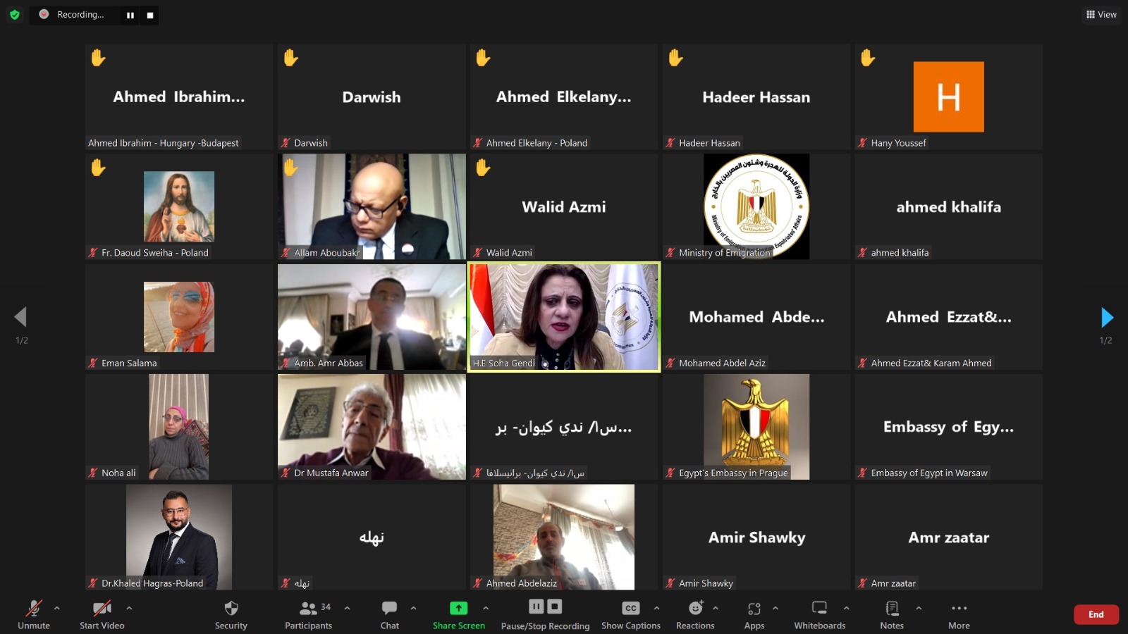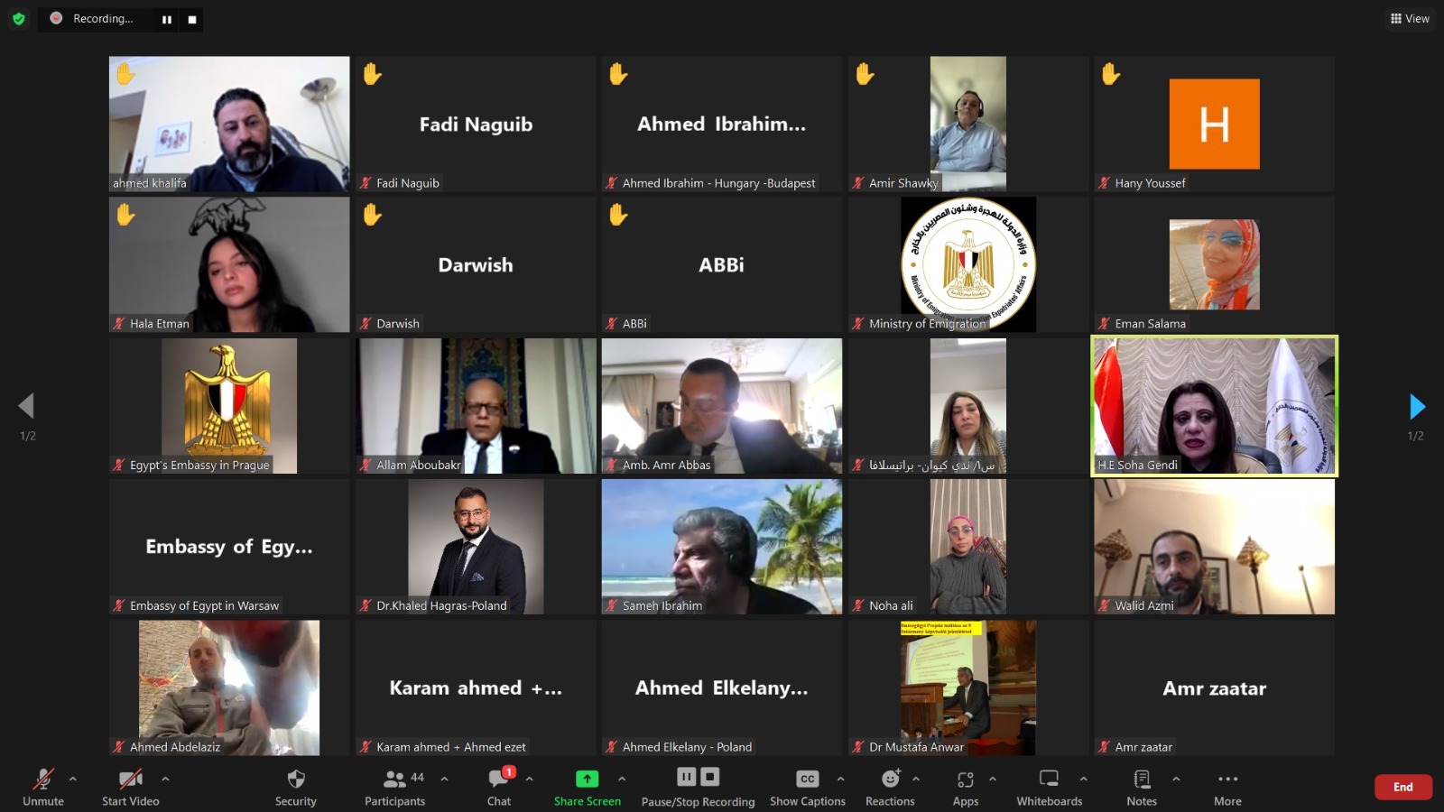 وفي بداية الاجتماع، رحبت وزيرة الهجرة، بجميع أعضاء ورموز الجاليات المصرية في المجر وبولندا والتشيك وسلوفاكيا، موضحة أن استراتيجية الوزارة تستهدف التواصل مع كافة شرائح المصريين بالخارج، وفي إطارها يتم التواصل المباشر مع الجاليات المصرية بالخارج، والتي تسعى من خلالها لحل أي مشكلات أو تحديات تواجه المصريين بالخارج؛ مبينة أن مبادرة «ساعة مع الوزيرة» تعد واحدة من ركائز هذه الاستراتيجية، حيث تم تنفيذ ما بات يقرب من ١٠٠ لقاء مع الجاليات افتراضيًا في إطار المبادرة، هذا خلاف اللقاءات القطاعية للأطباء والطلبة ودول النزاعات والمستثمرين وغيرهم الكثير، بهدف التواصل المستمر والفاعل والوصول لأكبر عدد من الجاليات بكل دول العالم. وخدمة أكبر قدر من المصريين وتذليل ايه تحديات يتعرضون لها.