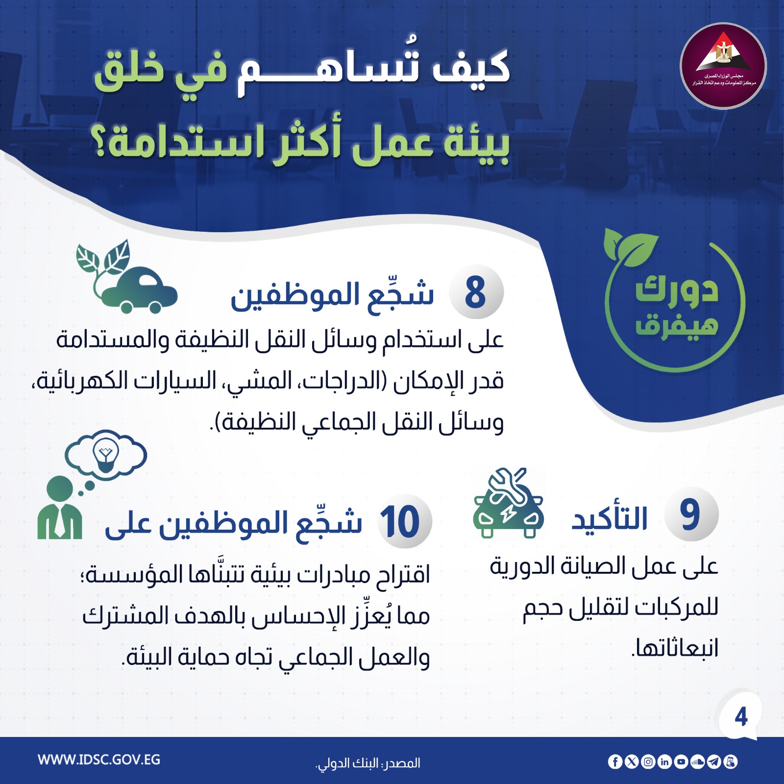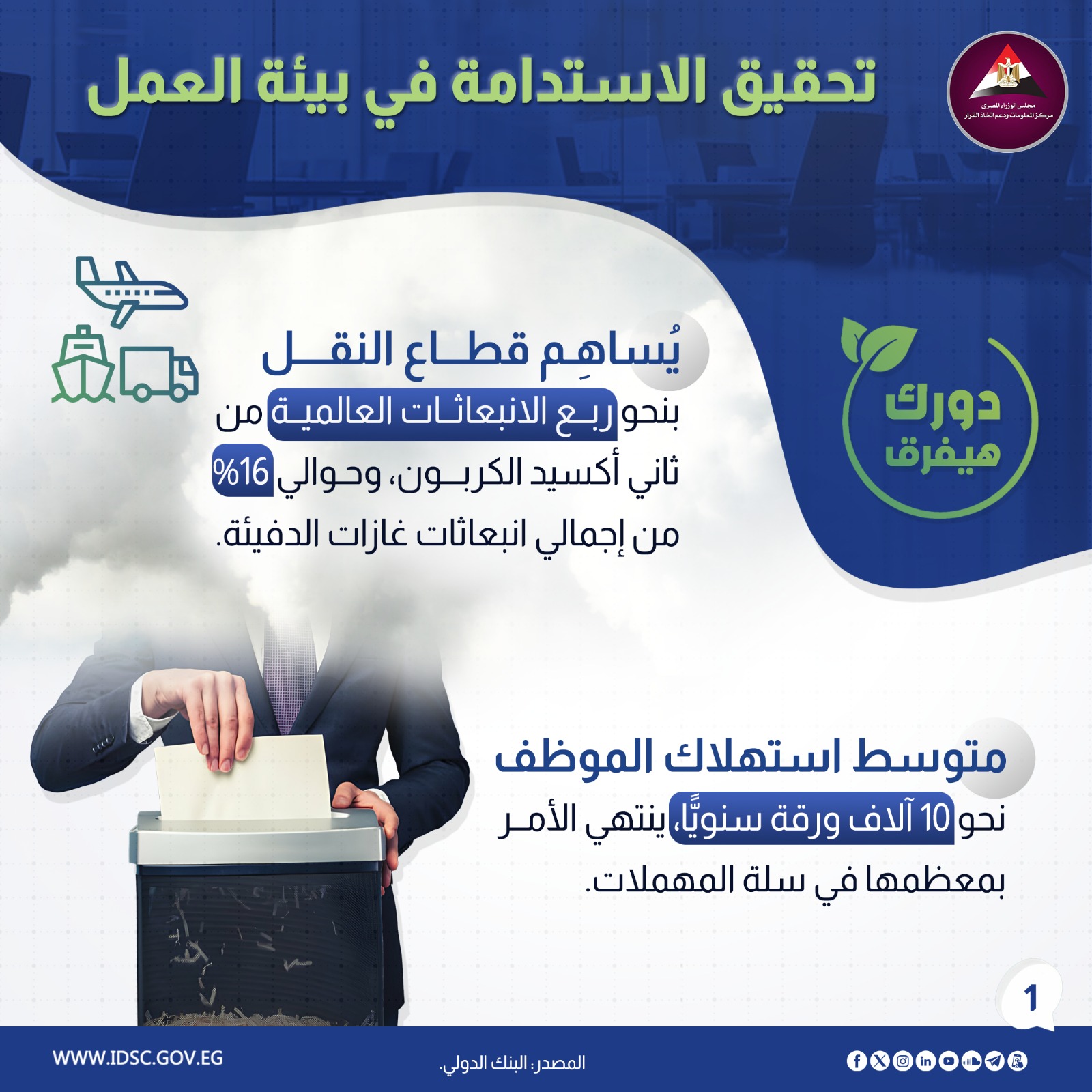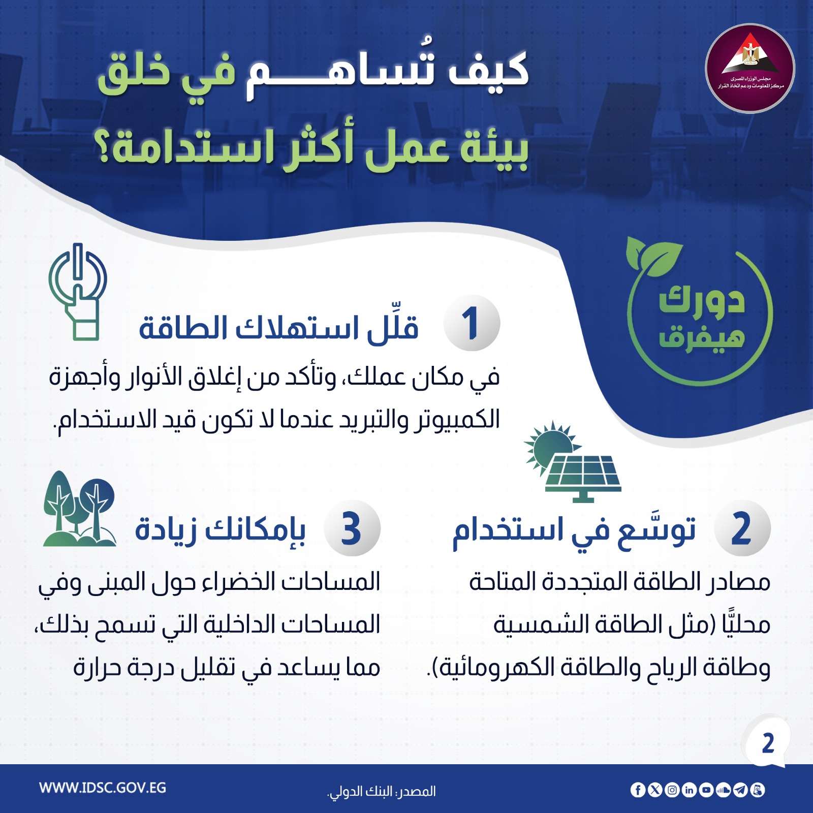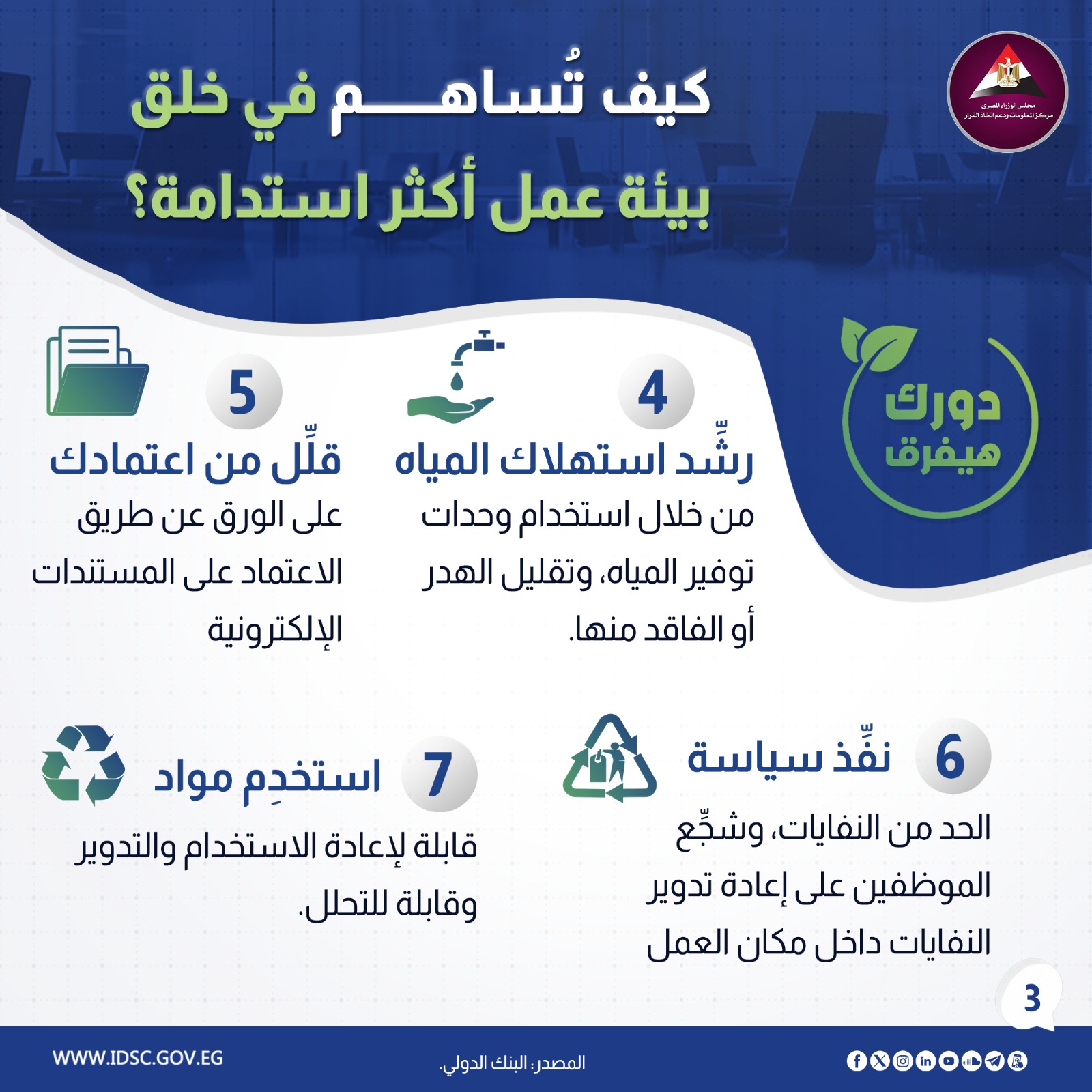 نشرت الصفحة الرسمية لمركز المعلومات ودعم اتخاذ القرار بمجلس الوزراء على موقع التواصل الاجتماعي "فيسبوك" إنفوجراف جديدا تحت عنوان (كيف تساهم في خلق بيئة عمل أكثر استدامة ؟)