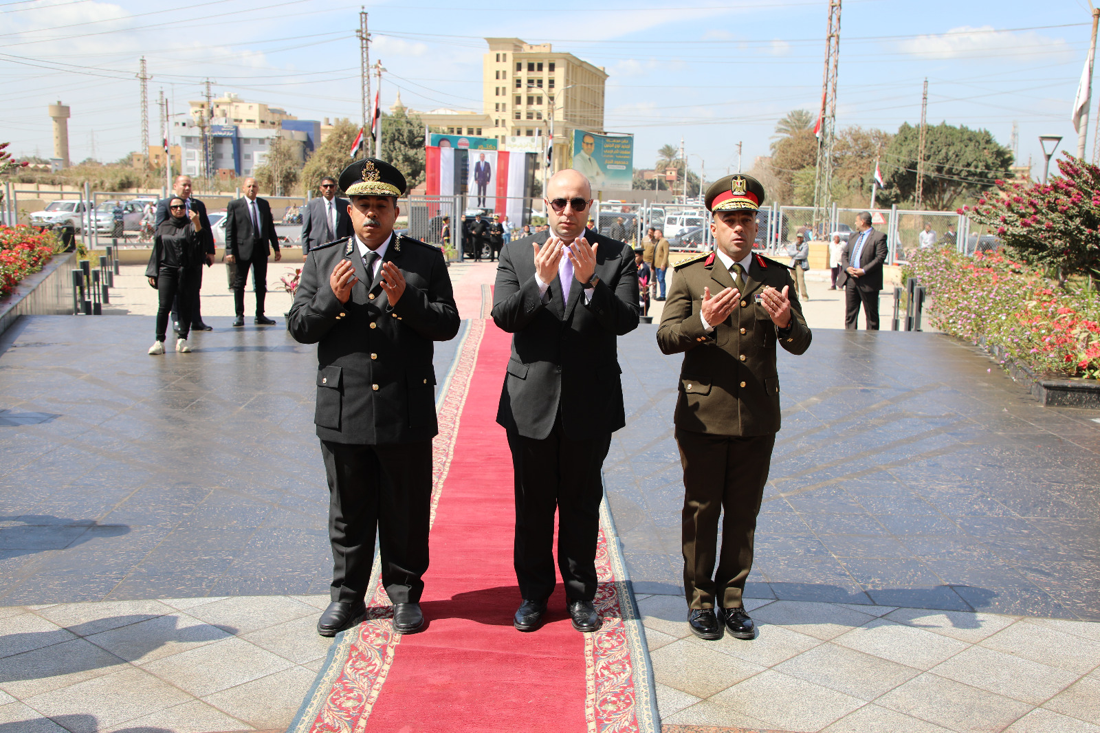 احتفالًا بالعيد القومي، محافظ بني سويف يضع أكليل الزهور على الُنصب التذكارى للشهداء (صور)