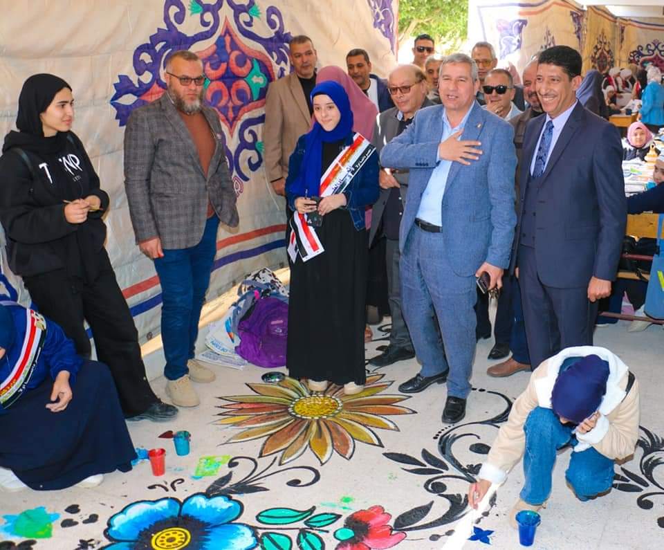 ثم استمتع وكيل الوزارة لعزف النشيد الوطني من طالب وطالبة علي الآلات الموسيقية، ثم التقى بطالبات يقمن بعمل الأشغال اليدوية تطريز وهاند ميد، ثم تفقد مسابقة الرسم على الأسفلت للطالبات