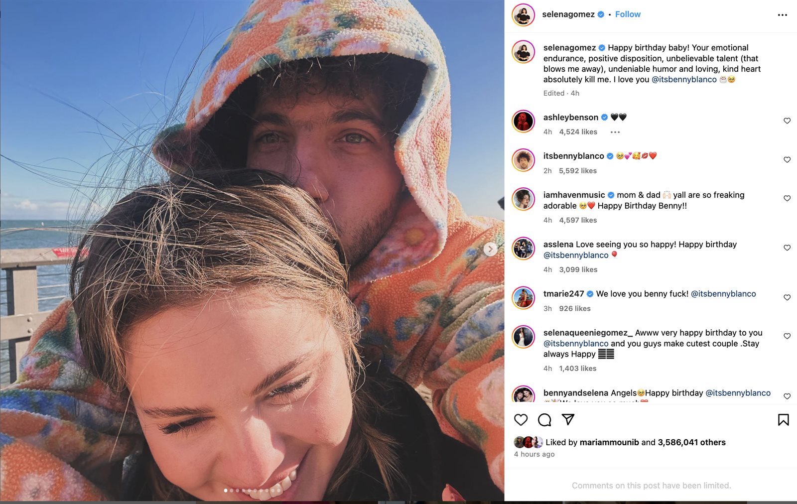 وارفقت سيلينا جوميز، الصور الرومانسية التي نشرتها، بتعليق قائلة: "عيد ميلاد سعيد يا حبيبي، إن قدرتك على التحمل العاطفي، وتصرفاتك الإيجابية، وموهبتك المذهلة (التي تذهلني بعيدًا)، وروح الدعابة التي لا يمكن إنكارها وقلبك الطيب المحبب تقتلني تمامًا..أحبك".