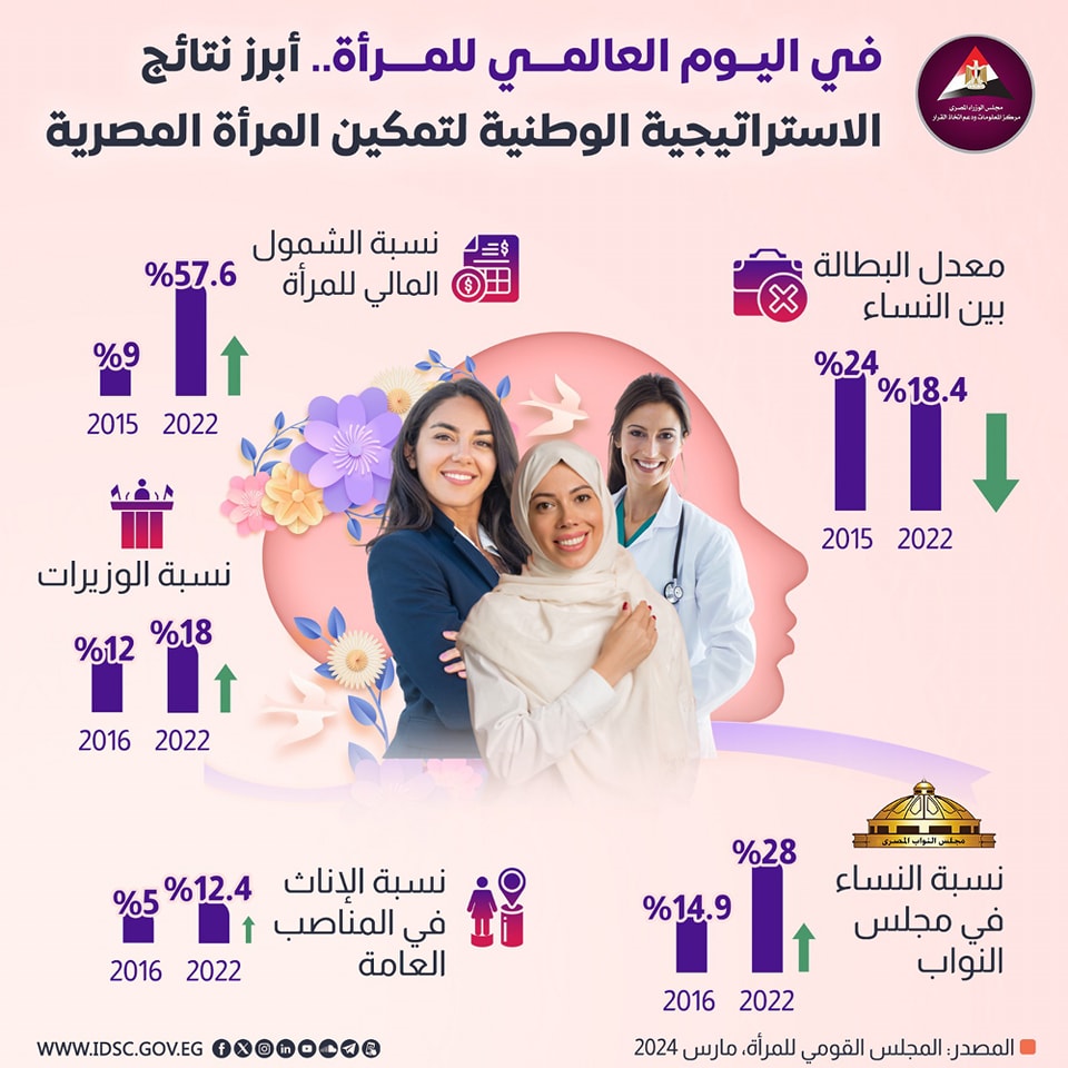 نشرت الصفحة الرسمية لمركز المعلومات ودعم اتخاذ القرار بمجلس الوزراء على موقع التواصل الاجتماعي "فيسبوك" إنفوجرافًا جديدًا تحت عنوان (في اليوم العالمي للمرأة.. أبرز نتائج الإستراتيجية الوطنية لتمكين المرأة المصرية)