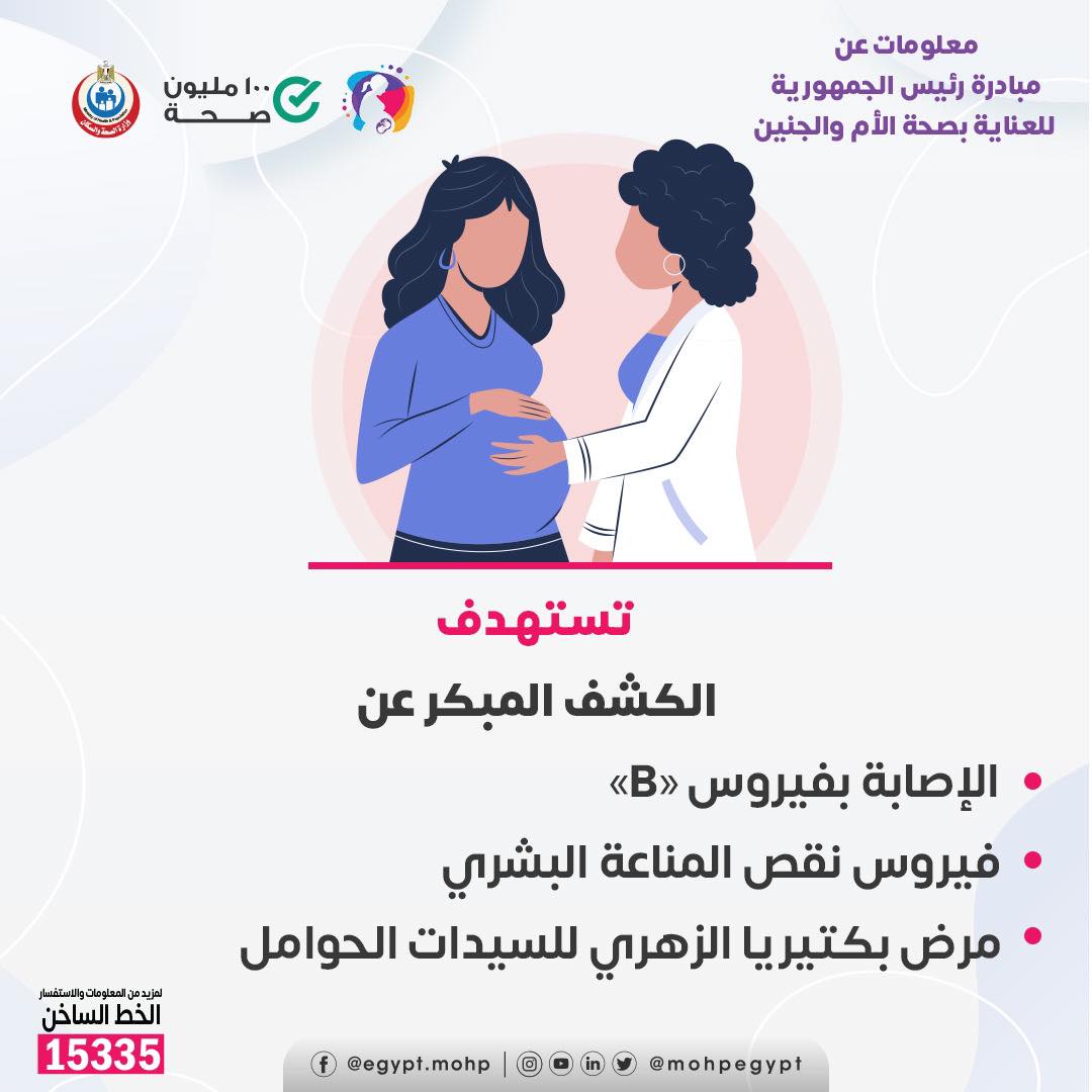 وأشار الدكتور حسام عبدالغفار المتحدث الرسمي لوزارة الصحة والسكان، إلى أن المبادرة تستهدف الكشف المبكر عن الإصابة بالأمراض المنتقلة من الأم للجنين، وتوفير العلاج والرعاية الصحية بالمجان، كما تستهدف الكشف المبكر عن الإصابة بفيروس «بي» وفيروس نقص المناعة البشري، ومرض الزهري للسيدات الحوامل.