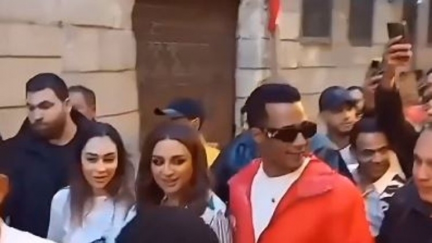 وتدافع عدد كبير من الجمهور على أنغام ومحمد رمضان أثناء تصويرهما إعلانًا جديدًا من المفترض عرضه في رمضان 2024 لالتقاط الصور التذكارية برفقتهم.