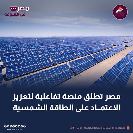 نشرت الصفحة الرسمية لمركز المعلومات ودعم اتخاذ القرار بمجلس الوزراء على موقع التواصل الاجتماعي "فيسبوك" منشورا جديدا تحت عنوان (مصر تطلق منصة تفاعلية لتعزيز الاعتماد على الطاقة الشمسية).