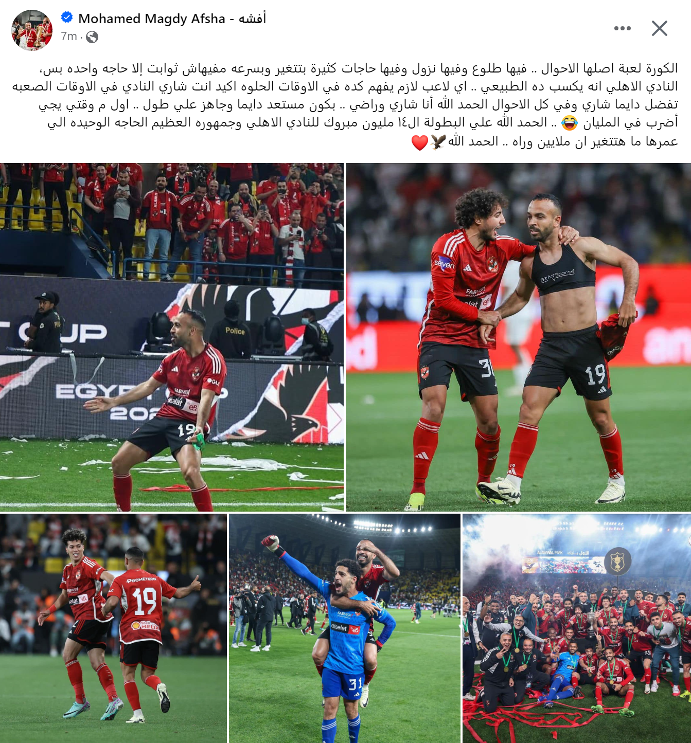 كأس مصر، أطلق محمد مجدي أفشة لاعب الفريق الأول لكرة القدم بالنادي الأهلي، تعليقًا جديدًا على تتويج ناديه بكأس مصر أمس الأول على حساب الزمالك.