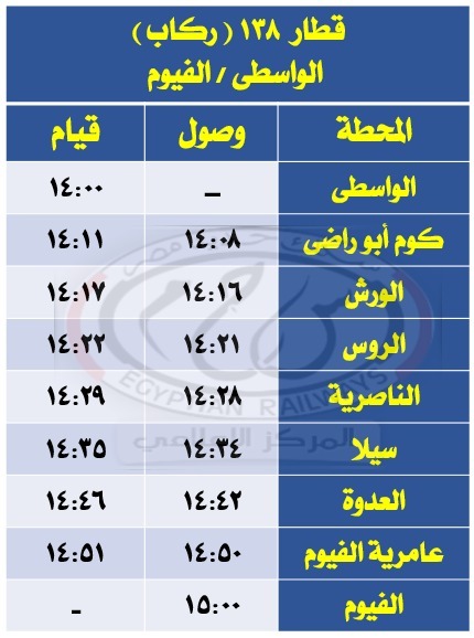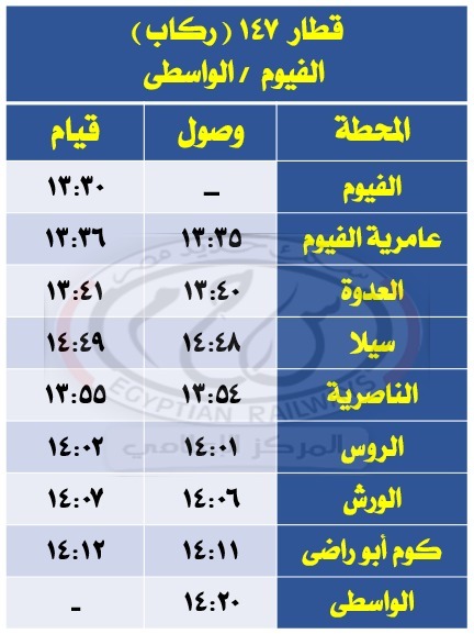 - تعديل ميعاد قطاري 147 و138 ركاب الفيوم / الواسطي والعكس كالجداول المرفقة.