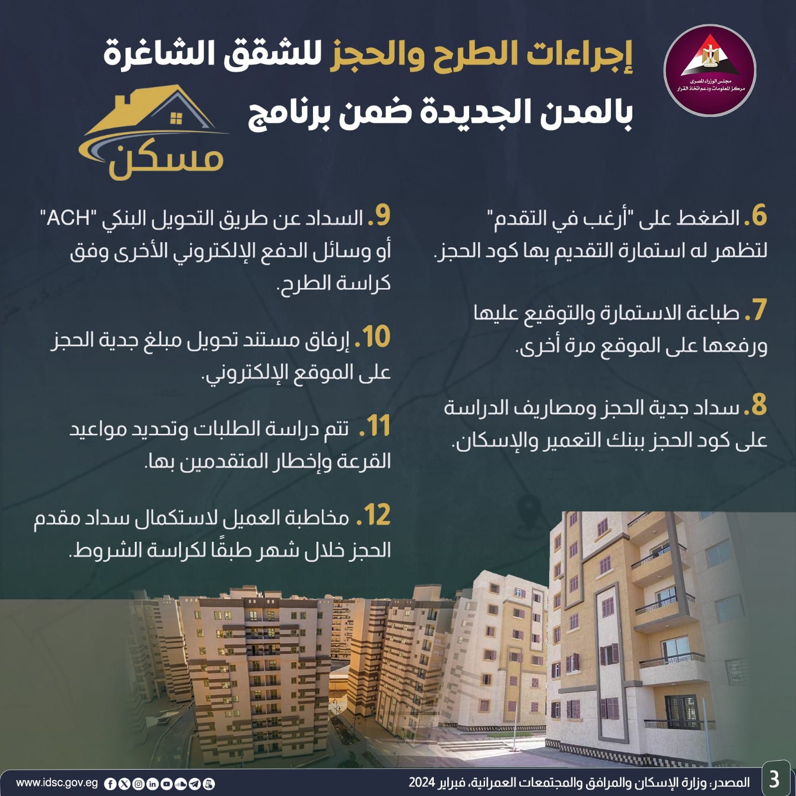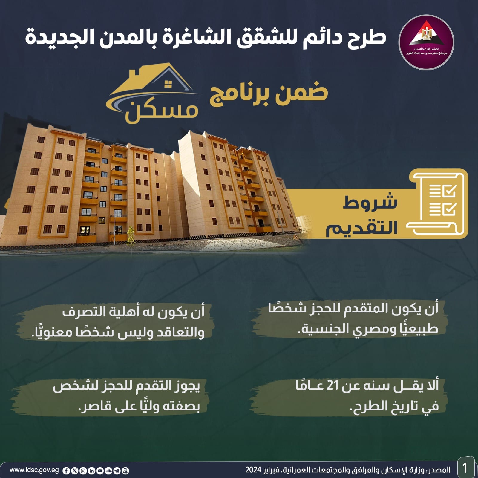 نشرت الصفحة الرسمية لمركز المعلومات ودعم اتخاذ القرار بمجلس الوزراء على موقع التواصل الاجتماعي "فيسبوك" إنفوجراف جديدا تحت عنوان (طرح دائم للشقق الشاغرة بالمدن الجديدة ضمن برنامج مسكن ).