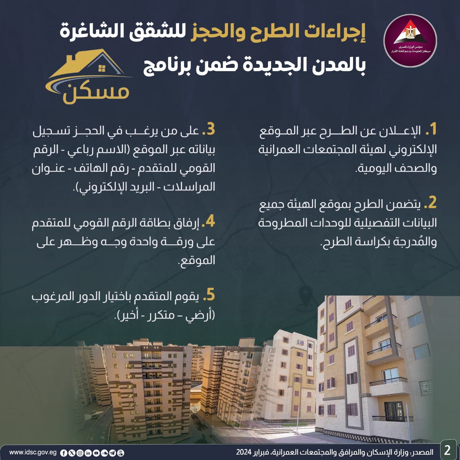 تعرف على إجراءات طرح وحجز الشقق الجديدة ضمن برنامج مسكن (إنفوجراف)