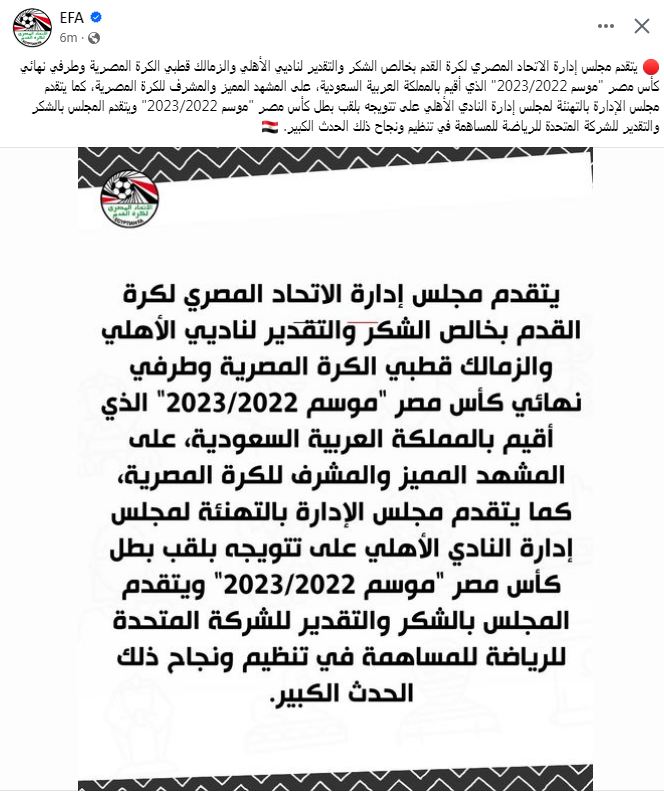 يتقدم مجلس إدارة الاتحاد المصري لكرة القدم بخالص الشكر والتقدير لناديي الأهلي والزمالك قطبي الكرة المصرية وطرفي نهائي كأس مصر "موسم 2023/2022" الذي أقيم بالمملكة العربية السعودية، على المشهد المميز والمشرف للكرة المصرية، كما يتقدم مجلس الإدارة بالتهنئة لمجلس إدارة النادي الأهلي على تتويجه بلقب بطل كأس مصر "موسم 2023/2022".
