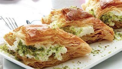 ادهني صينية الفرن بقليل من الزيت، ثم ضعي العجينة بالصينية، وزينيها بالفستق وادخليها الفرن.