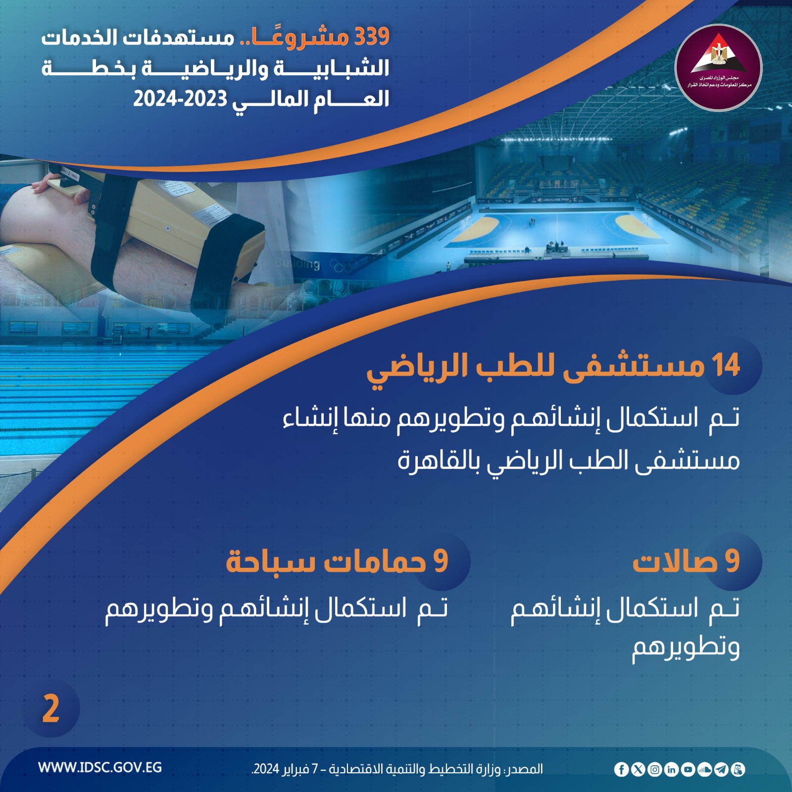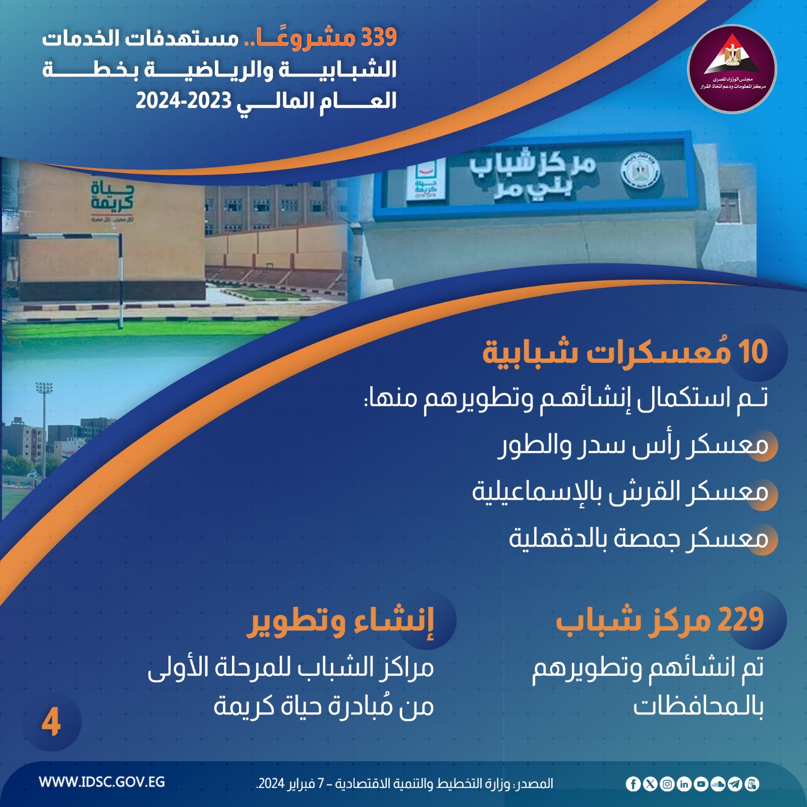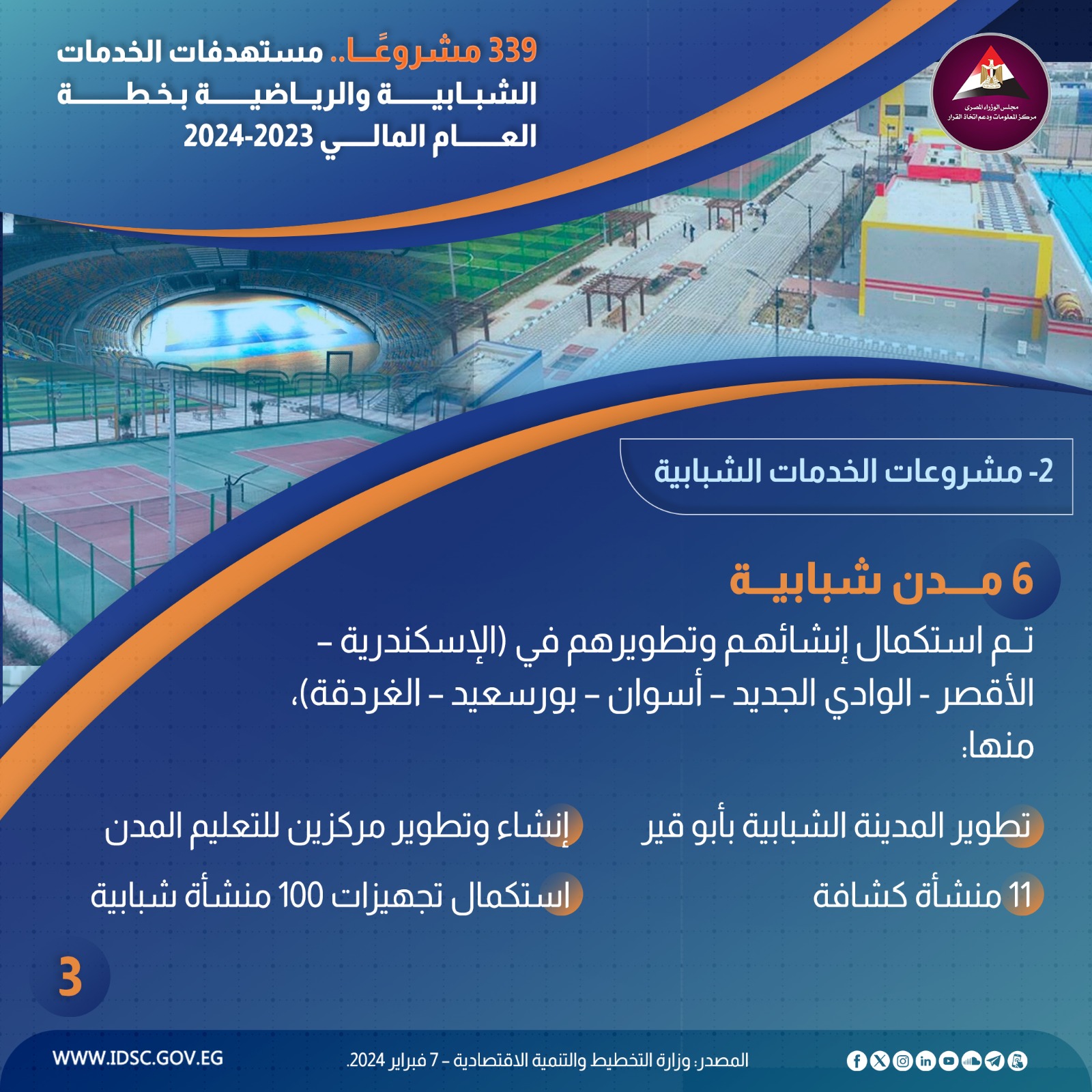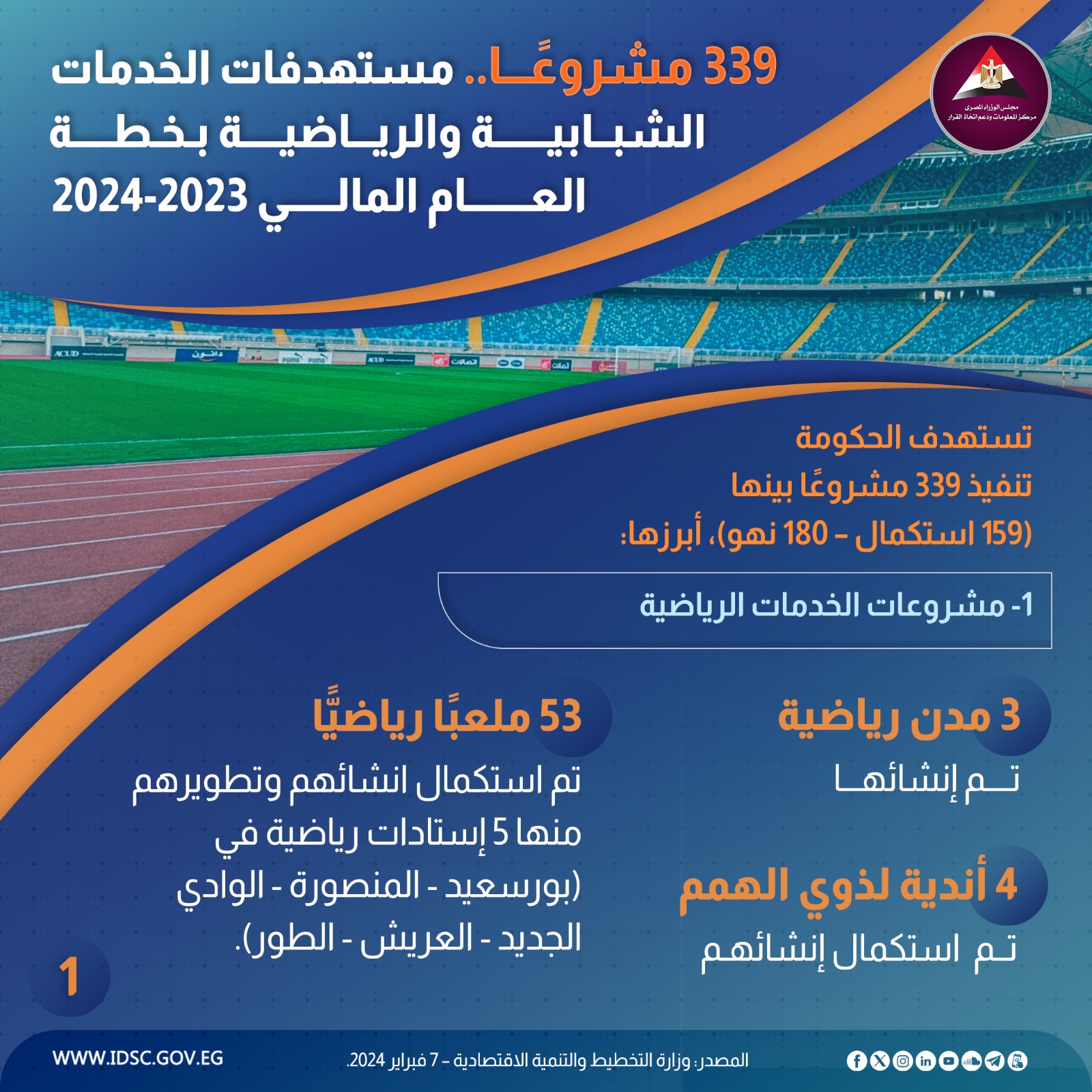 نشرت الصفحة الرسمية لمركز المعلومات ودعم اتخاذ القرار بمجلس الوزراء على موقع التواصل الاجتماعي "فيسبوك" إنفوجراف جديدا تحت عنوان (339 مشروعًا..مستهدفات الخدمات الشبابية والرياضية بخطة العام المالي 2023- 2024)
