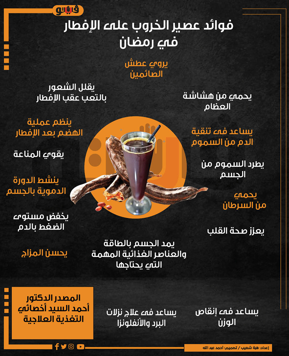فوائد عصير الخروب على الإفطار في رمضان (إنفوجرافيك) الإثنين 11/مارس/2024 - 04:00 م 3/11/2024 4:00:55 PM فوائد عصير الخروب، فيتو هبة شعيب شارك طباعة 18 حجم الخط شارك طباعة الخروب عصير الخروب فوائد عصير الخروب الدكتور أحمد السيد صحة الصحة شهر رمضان المبارك
