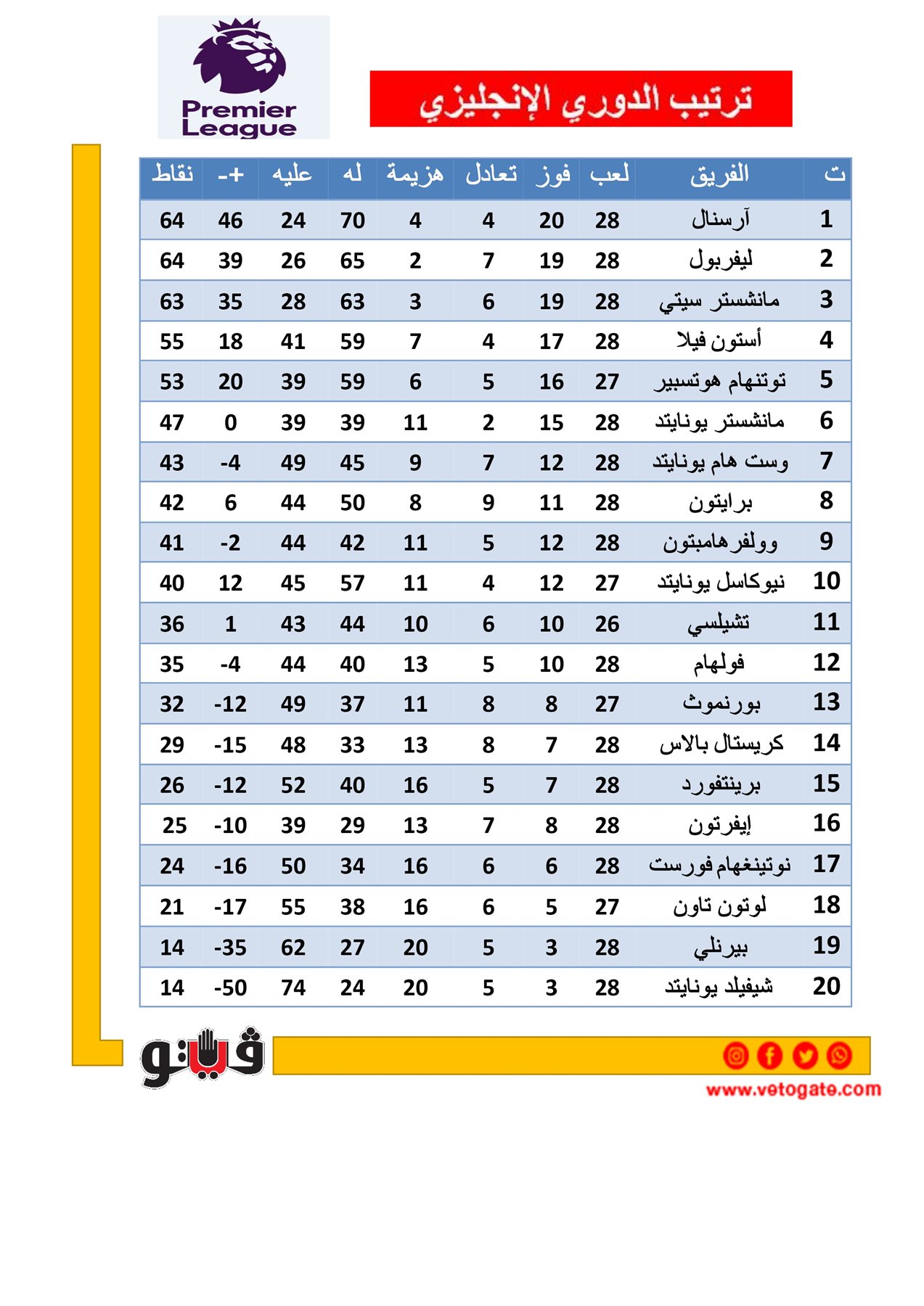 1- آرسنال 64 نقطة.
