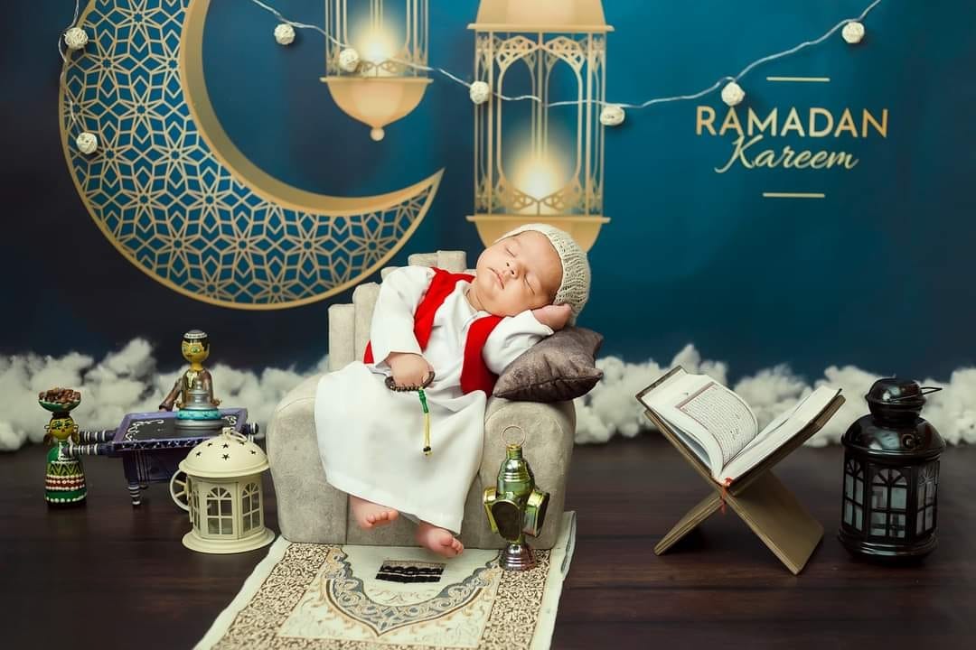 زياد نفذ سيشن تصوير لطفل، فرح باستقبال الشهر الكريم، فارتدى جلبابا أبيض ناصعا، وأمسك بمسبحة، وجلس يحاول جاهدا أن يقرأ من مصحف شريف، إلا أن النعاس غالبه، فاستسلم لنوم عميق، في مشهد يأسر القلوب.