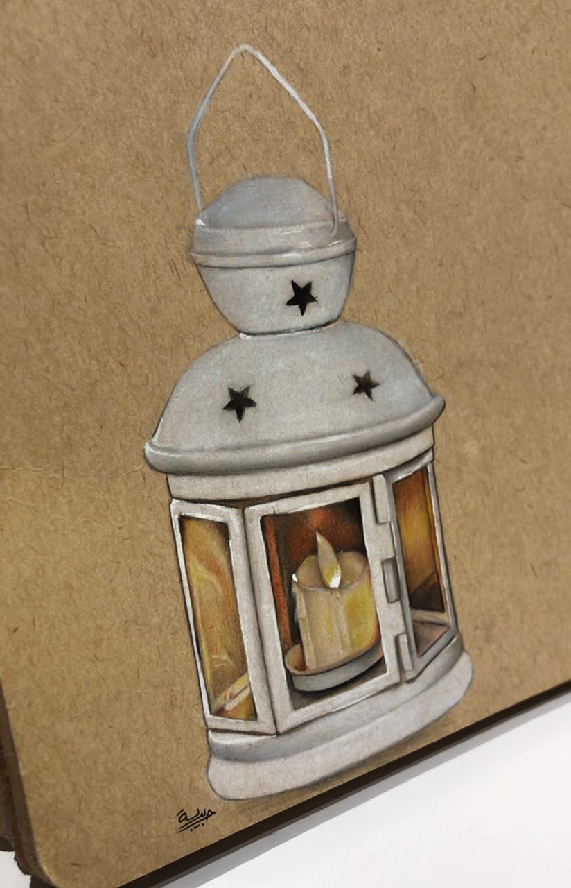 لوحة جميلة قامت برسمها على ورق كرافت، تمثل فانوسا تطل منه الشمعة، وكأنه يحتضنها ويحميها من تيارات الهواء في الخارج، بألوان هادئة بديعة.