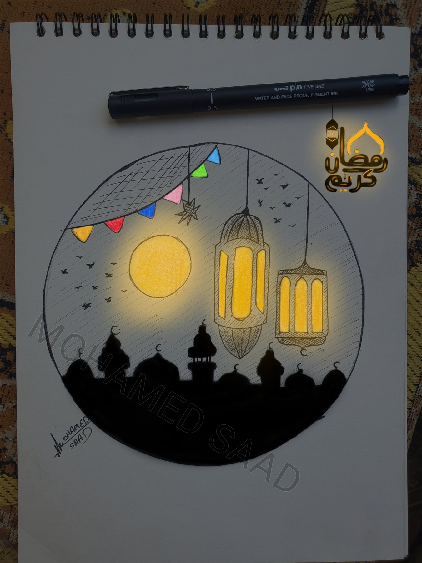 شادي رسم لوحة تعبر عن فانوس رمضان بشكل جميل، وبالقرب منه هلال الشهر الكريم، وتعطر اللوحة وردة حمراء.