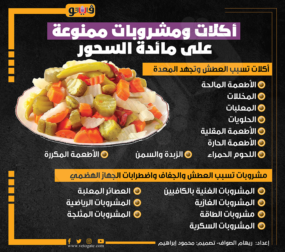 أكلات ومشروبات ممنوعة على مائدة السحور (إنفوجراف) الإثنين 11/مارس/2024 - 08:39 م 3/11/2024 8:39:53 PM أطعمة ومشروبات، فيتو ريهام الصواف شارك طباعة 18 حجم الخط شارك طباعة اكلات ممنوعة في السحور مشروبات ممنوعة في السحور اطعمة ممنوعة خلال الصيام اطعمة ومشروبات ممنوعة في السحور اكلات تسبب العطش في الصيام مشروبات تسبب الجفاف في الصيام