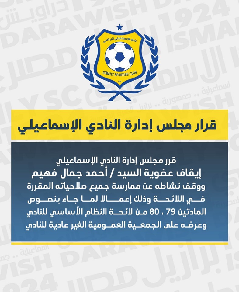 قرر مجلس إدارة النادي الإسماعيلي إيقاف عضوية أحمد جمال فهيم، عضو مجلس الإدارة، ووقف نشاطه عن ممارسة جميع صلاحياته المقررة فى اللائحة.