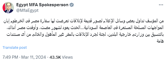 وأضاف المتحدث باسم وزارة الخارجية عبر تغريدة من حسابه الرسمي علي موقع التواصل الإجتماعي "اكس": "الحدث يعود لشهور مضت، وأوفدت مصر آنذاك، بالتنسيق بين وزارتى خارجية البلدين، لجنة لجرد الإتلافات بالمقر غير المأهول والخالى من أى مستندات هامة".