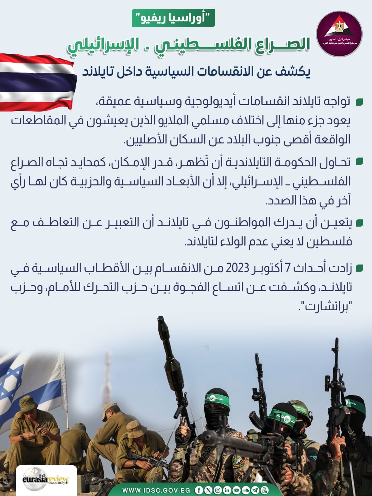 نشرت الصفحة الرسمية لمركز المعلومات ودعم اتخاذ القرار بمجلس الوزراء على موقع التواصل الاجتماعي "فيسبوك" إنفوجراف جديدا تحت عنوان (الصراع الفلسطيني- الإسرائيلي يكشف عن الانقسامات السياسية داخل تايلاند).