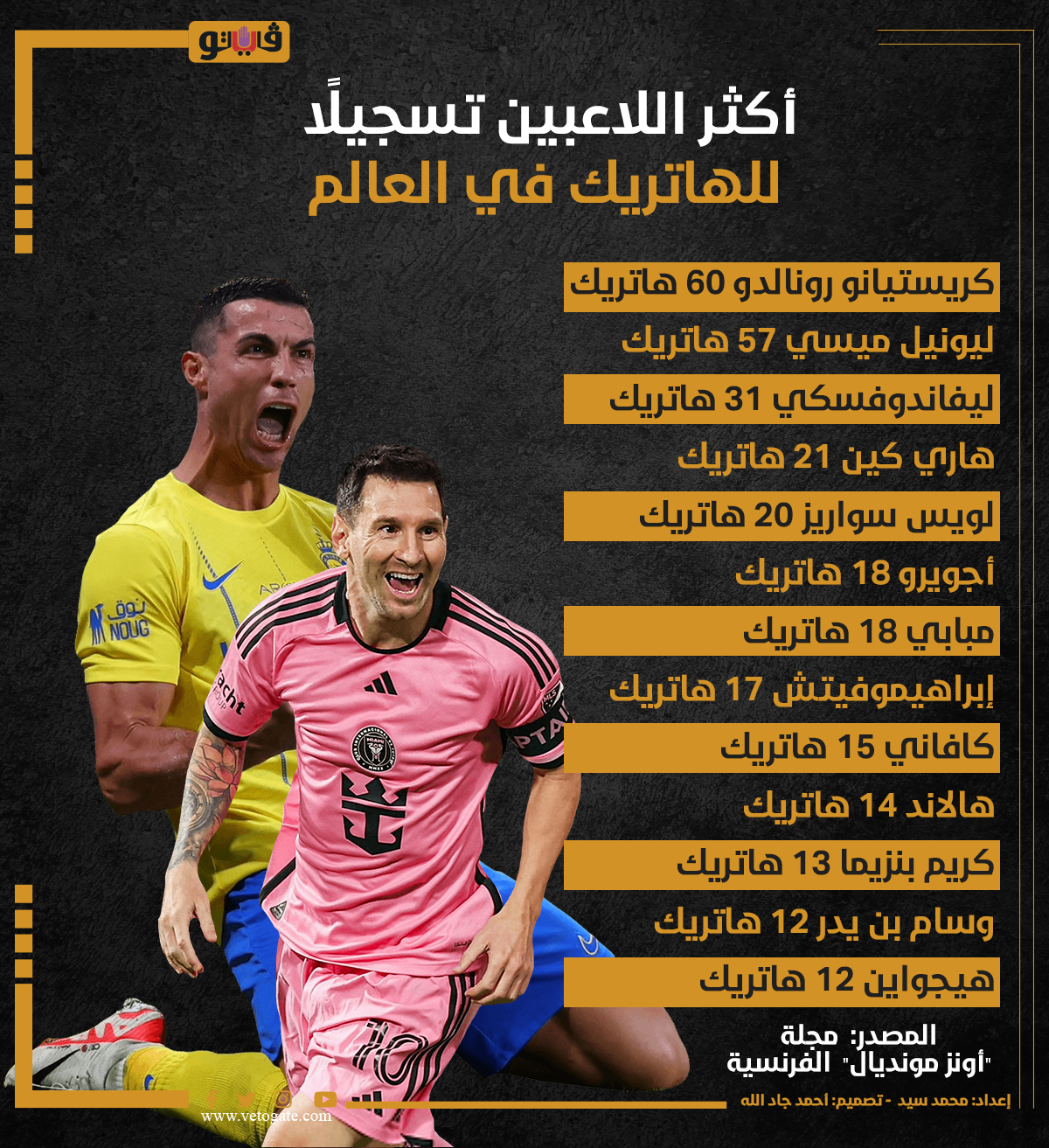 أكثر اللاعبين تسجيلًا للهاتريك في العالم (إنفوجراف) الثلاثاء 12/مارس/2024 - 10:27 ص 3/12/2024 10:27:04 AM ميسي ورونالدو، فيتو محمد سيد شارك طباعة 18 حجم الخط شارك طباعة كريستيانو رونالدو ميسي مبابي ليفاندوفسكي هالاند هاري كين كريم بنزيما