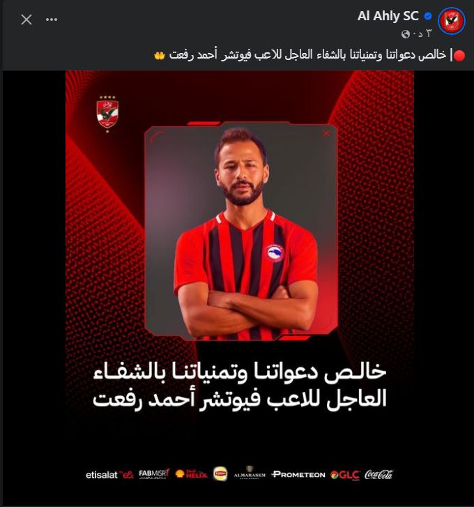 كما نشر حساب النادي الأهلي عبر موقع التواصل الاجتماعي “فيسبوك”، منشورا للدعاء لأحمد رفعت لاعب نادي فيوتشر بالشفاء العاجل، والذي أصيب بالإغماء أثناء مباراة فريقه أمام الاتحاد السكندري بإستاد الإسكندرية.