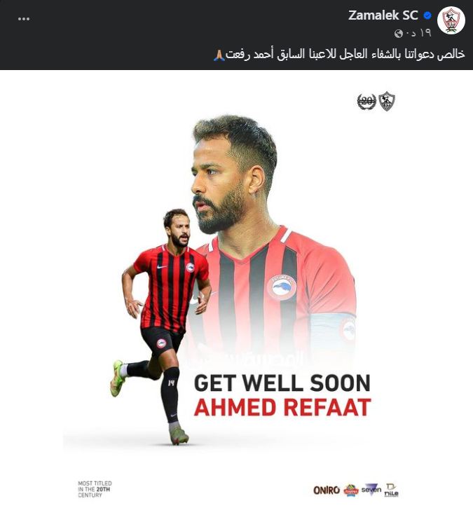 وعلق عليها قائلا: “خالص دعواتنا بالشفاء العاجل للاعبنا السابق أحمد رفعت”.