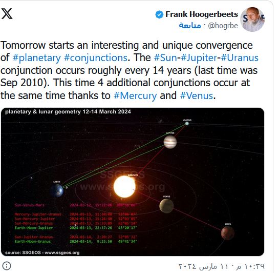 وقال "هوجربيتس" عبر حسابه في "إكس" تويتر سابق، إنه يبدأ غدًا - الأربعاء - تقارب مثير وفريد من نوعه لاقترانات الكواكب.