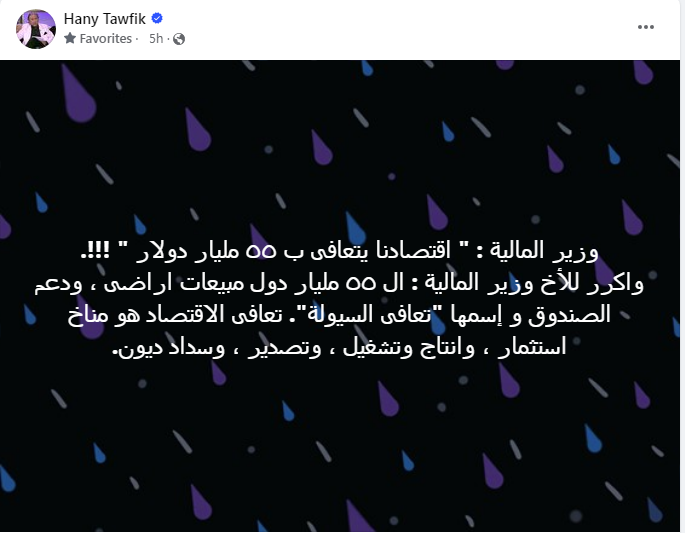وقال هاني توفيق، عن الاقتصاد المصري، في رسالته القوية التي وجهها لوزير المالية محمد معيط: "اقتصادنا يتعافى بـ ٥٥ مليار دولار "!. وأكرر للأخ وزير المالية الـ ٥٥ مليار دول مبيعات أراضي، ودعم الصندوق واسمها "تعافى السيولة".