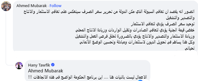 وعندما علق أحد متابعيه قائلًا: "اتصور أنه يقصد أن تعافي السيولة الذي مكن الدولة من تحرير سعر الصرف سينعكس على تعافي الاستثمار والانتاج والتصدير والتشغيل توحيد سعر الصرف يؤدي لتعافي الاستثمار خفض قيمة الجنيه يؤدي لتعافي الصادرات وتقليل الواردات وزيادة الانتاج المحلي وزيادة الاستثمار والتصدير والانتاج يؤدي بالضرورة لخلق فرص العمل والتشغيل وكل هذا يساهم في تحويل الديون لاستثمارات ومبادلة وتحسين الوضع الأتماني"، رد الخبير الاقتصادي هاني توفيق قائلًا: "الاعمال ليست بالنيات هنا... أين برنامج الحكومة الواضح فى هذه الاتجاهات!"