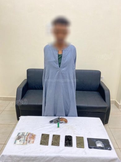 وضبط (عنصر إجرامي "له معلومات جنائية")، وبحوزته (2 كيلو جرام لمخدر الحشيش- فرد محلى وطلقة).