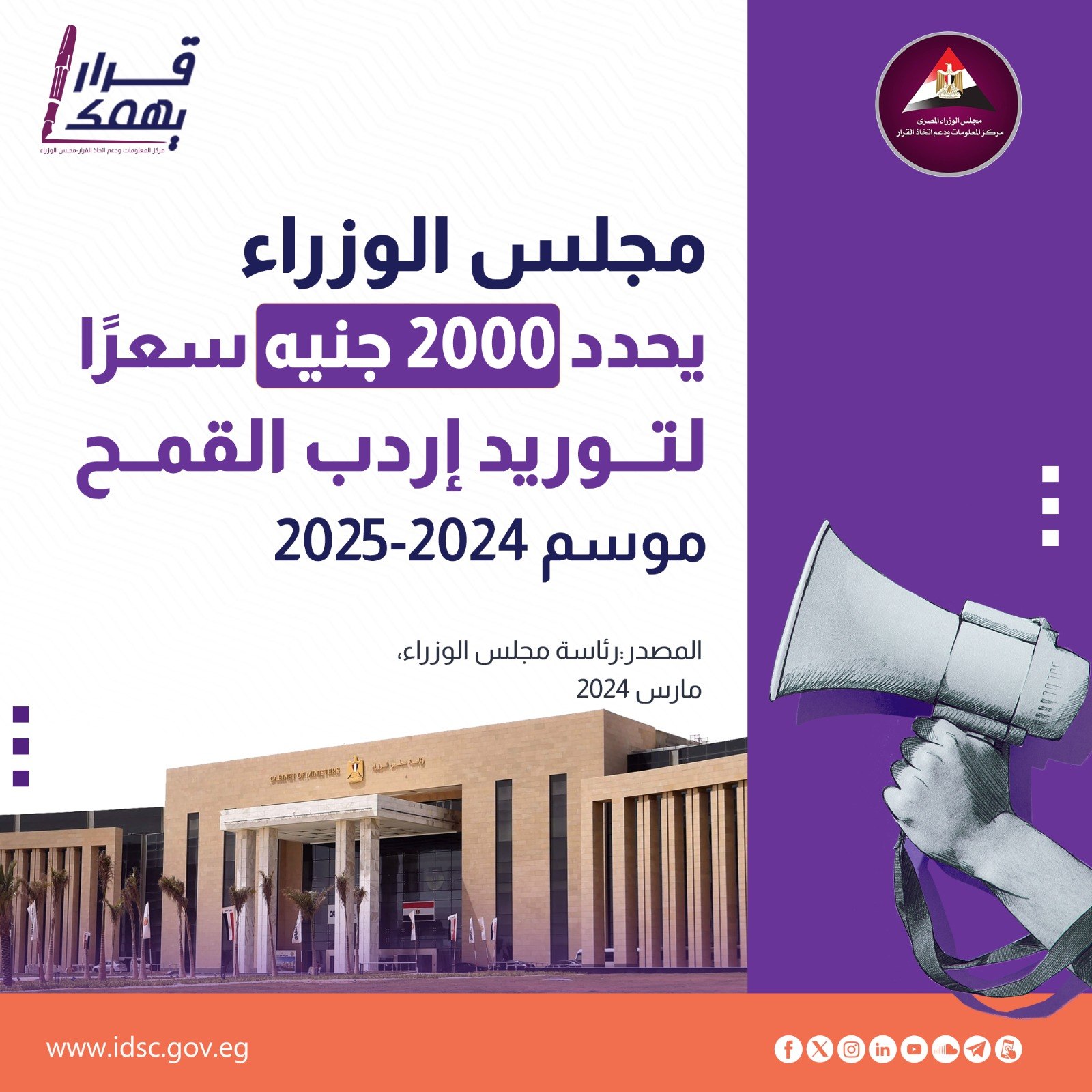 نشرت الصفحة الرسمية لمركز المعلومات ودعم اتخاذ القرار بمجلس الوزراء على موقع التواصل الاجتماعي "فيسبوك" منشورا جديدا تحت عنوان (مجلس الوزراء يحدد 2000جنيه سعرًا لتوريد إردب القمح موسم 2024 -2025)