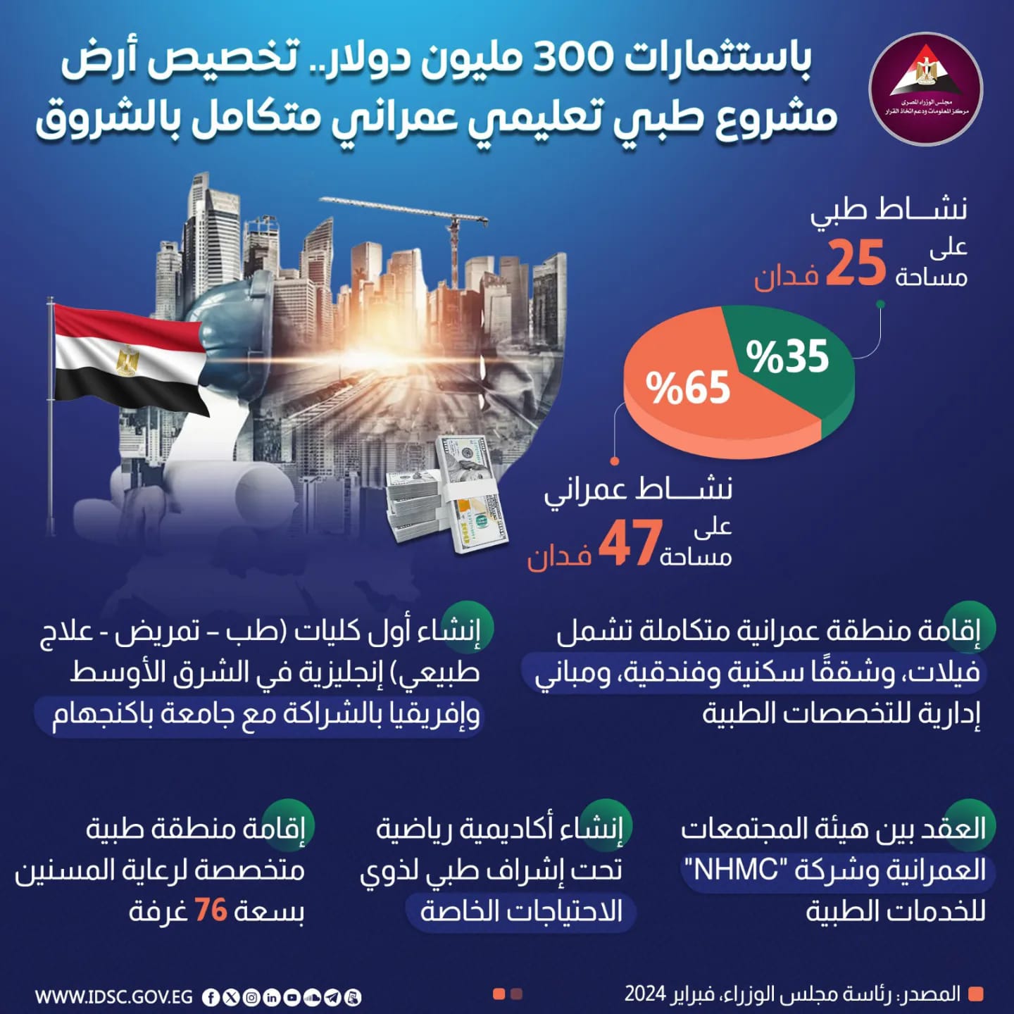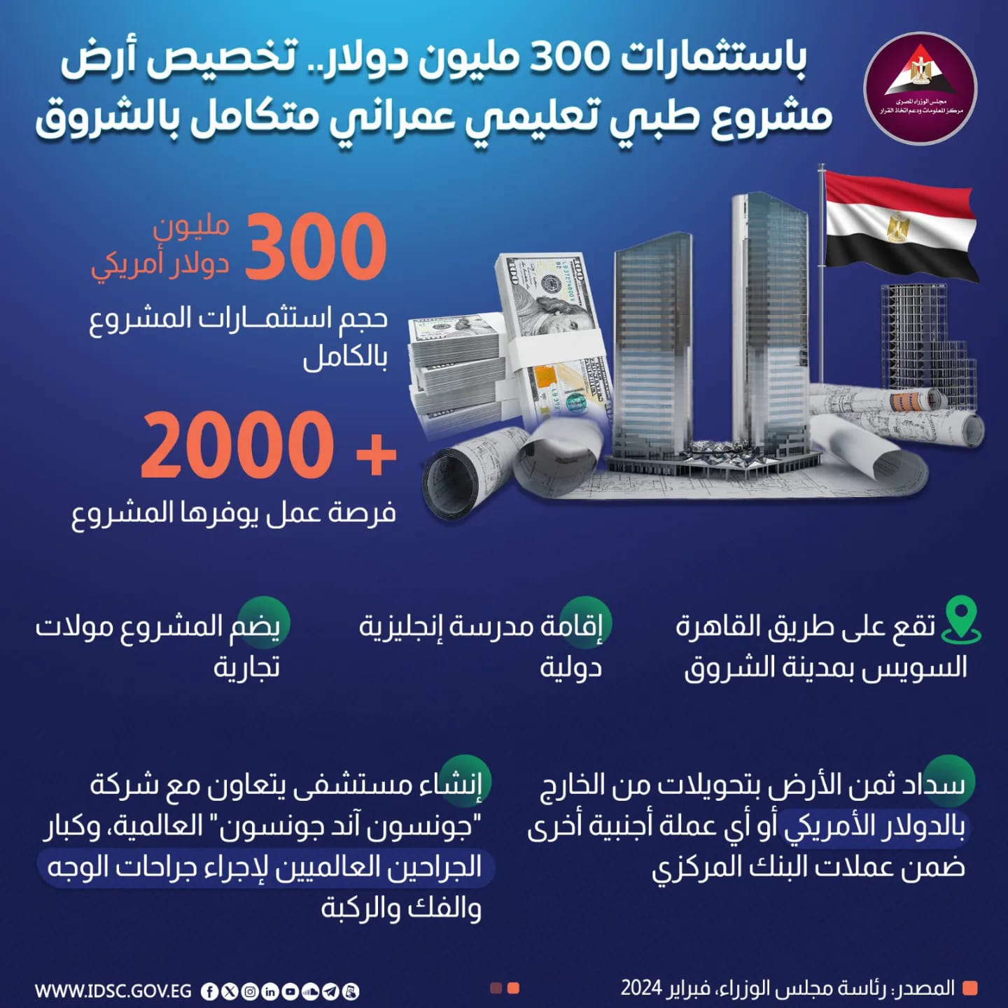 نشرت الصفحة الرسمية لمركز المعلومات ودعم اتخاذ القرار بمجلس الوزراء على موقع التواصل الاجتماعي"فيسبوك" إنفوجرافا، تحت عنوان (باستثمارات 300مليون دولار..تخصيص أرض مشروع طبي تعليمي عمراني متكامل بالشروق )
