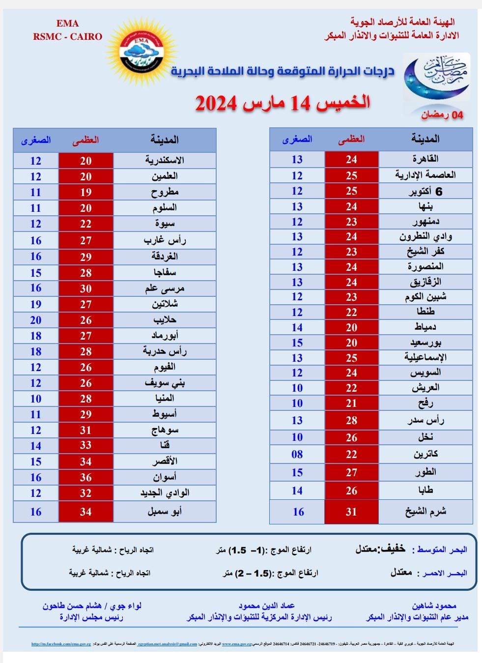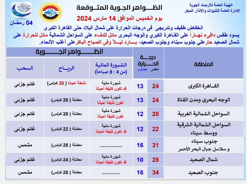 ونشرت هيئة الأرصاد بيانا بدرجات الحرارة المتوقعة اليوم، وجاء كالتالي: